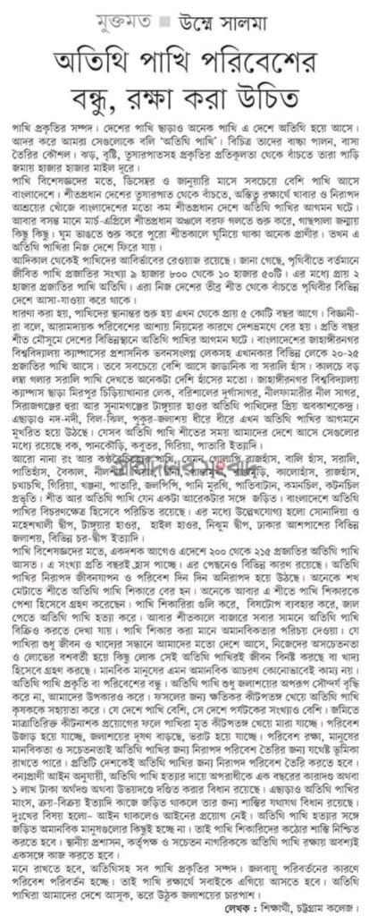 মনে রাখতে হবে, অতিথিসহ সব পাখি প্রকৃতির সম্পদ। জলবায়ু পরিবর্তনের কারণে পরিবেশ পরিবর্তন হচ্ছে। তাই পাখি রক্ষার্থে সবাইকে এগিয়ে আসতে হবে। অতিথি পাখিরা আমাদের দেশে আসুক, ভরে উঠুক জলাশয়ের চারপাশ