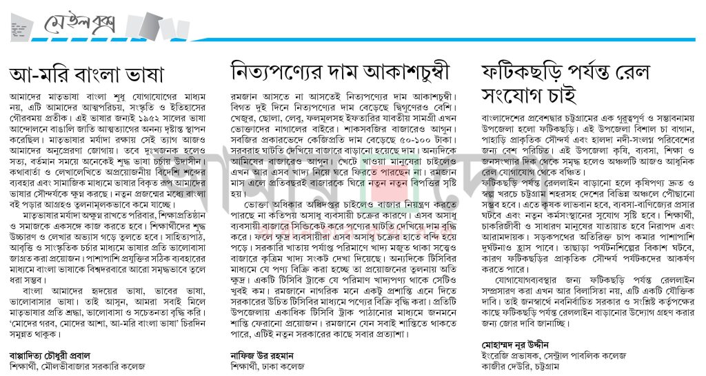 হোম / কর্তৃপক্ষের দৃষ্টি আকর্ষণ / নিবন্ধআ-মরি বাংলা ভাষা বাপ্পাদিত্য চৌধুরী প্রবাল , মৌলভীবাজার সরকারি কলেজ প্রকাশ: ২২ ফেব্রুয়ারি ২০২৬ পাঠ: ২৯ বার https://eamardesh.com/2026-02-22লেখক: সাধারণ সদস্য, জাতীয় বিশ্ববিদ্যালয়।এই লেখাটি ২২ ফেব্রুয়ারি ২০২৬ তারিখে আমার দেশ পত্রিকায় প্রকাশিত। লেখাটি শেয়ার করুন: