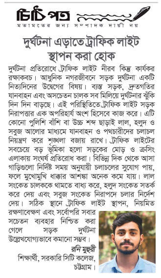 দুর্ঘটনা প্রতিরোধে ট্রাফিক লাইট নীরব কিন্তু কার্যকর রক্ষাকবচ।আধুনিক নগরজীবনে সড়ক দুর্ঘটনা একটি নিত্যদিনের উদ্বেগের বিষয়। ব্যস্ত সড়ক, দ্রুতগতির যানবাহন এবং অসচেতন চালক—সব মিলিয়ে দুর্ঘটনার ঝুঁকি দিন দিন বাড়ছে। এই পরিস্থিতিতে ট্রাফিক লাইট সড়ক নিরাপত্তার এক অপরিহার্য অংশ হিসেবে কাজ করে। এটি কোনো পুলিশি বাঁশি বা উচ্চ শব্দ ছাড়াই লাল, হলুদ ও সবুজ আলোর মাধ্যমে যানবাহন ও পথচারীদের চলাচল নিয়ন্ত্রণ করে শৃঙ্খলা বজায় রাখে।ট্রাফিক লাইটের সবচেয়ে বড় ভূমিকা হলো সড়কের মোড় ও ক্রসিং এলাকায় সংঘর্ষ প্রতিরোধ করা। বিভিন্ন দিক থেকে আসা গাড়িগুলো নির্দিষ্ট সময় অনুযায়ী চলাচলের সুযোগ পায়, ফলে মুখোমুখি ধাক্কার আশঙ্কা অনেক কমে যায়। লাল সংকেত চালককে থামতে বাধ্য করে, হলুদ সংকেত সতর্ক করে দেয় এবং সবুজ সংকেত নিরাপদে চলার নির্দেশ দেয়। এই সুশৃঙ্খল ব্যবস্থা হঠাৎ গতি বাড়ানো বা বেপরোয়া চালনার প্রবণতা কমায়।