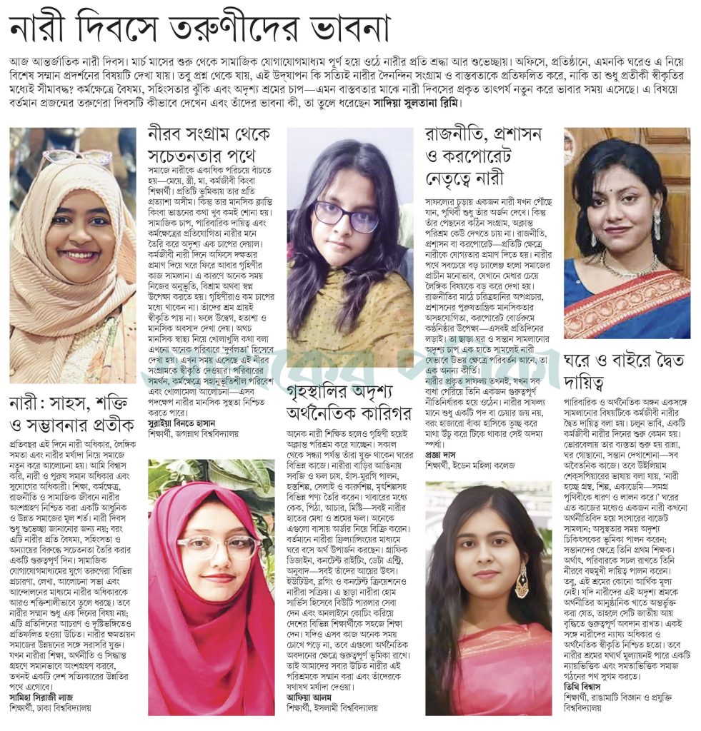 প্রতি বছর মার্চ এলেই সামাজিক যোগাযোগমাধ্যম ভরে ওঠে শুভেচ্ছা, ফুল আর অনুপ্রেরণামূলক বার্তায়। অফিসে, প্রতিষ্ঠানে, এমনকি ঘরেও নারী দিবস যেন এক দিনের বিশেষ সম্মান প্রদর্শনের উপলক্ষ। কিন্তু প্রশ্নটা থেকেই যায় এই উদযাপন কি নারীর জীবনের বাস্তব সংগ্রামকে প্রতিফলিত করে, নাকি তা কেবল প্রতীকী স্বীকৃতিতেই সীমাবদ্ধ? কর্মক্ষেত্রে বৈষম্য, সহিংসতার ঝুঁকি, অদৃশ্য শ্রমের চাপ এই বাস্তবতার ভেতর দাঁড়িয়ে নারী দিবসের প্রকৃত অর্থ কী, সেটাই এখন নতুন করে ভাবার সময়। বর্তমান সময়ের তরুণীরা নারী দিবস নিয়ে কী ভাবে, তাদের এই ভাবনা তুলে ধরেছে – সাদিয়া সুলতানা রিমি