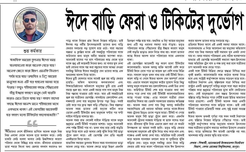 হোম / কলাম/মতামত / নিবন্ধঈদে বাড়ি ফেরা ও টিকিটের দুর্ভোগ শুভ কর্মকার , বেগম রোকেয়া বিশ্ববিদ্যালয়, রংপুর প্রকাশ: ১১ মার্চ ২০২৬ পাঠ: ১০৩ বার ঈদে বাড়ি ফেরা ও টিকিটের দুর্ভোগলেখক: সম্পাদকীয় পর্ষদ, বেগম রোকেয়া বিশ্ববিদ্যালয়।এই লেখাটি ১১ মার্চ ২০২৬ তারিখে সকালে বাণী পত্রিকায় প্রকাশিত। লেখাটি শেয়ার করুন: