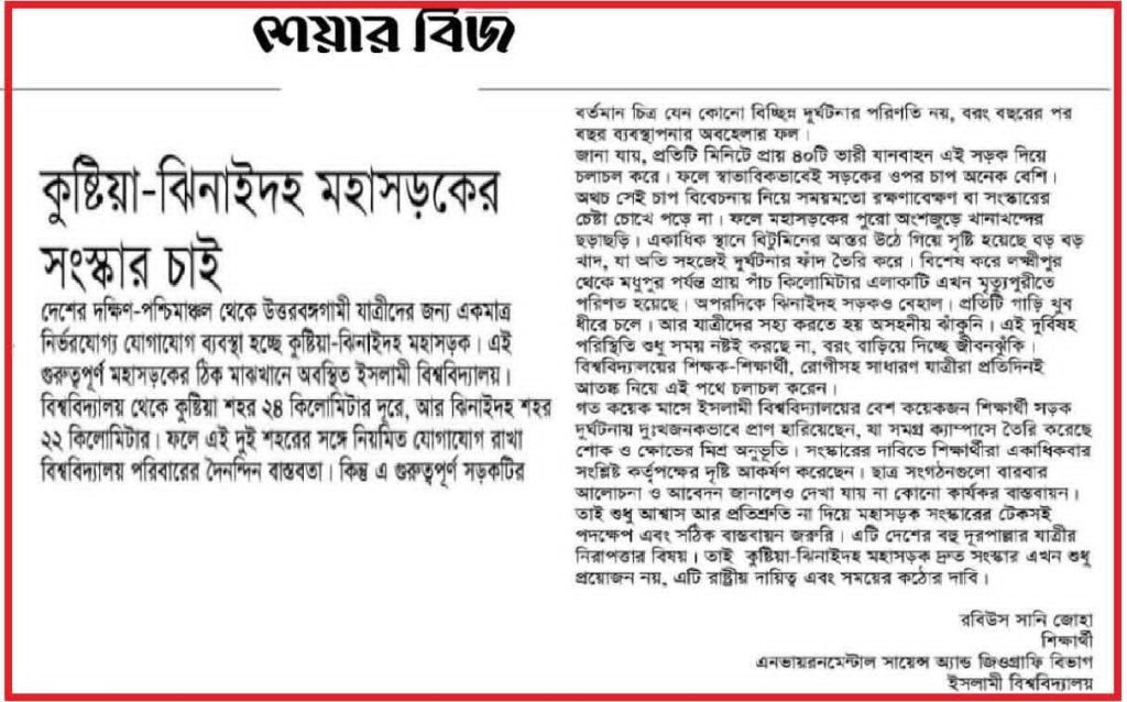 দেশের দক্ষিণ-পশ্চিমাঞ্চল থেকে উত্তরবঙ্গগামী যাত্রীদের জন্য একমাত্র নির্ভরযোগ্য যোগাযোগ ব্যবস্থা হচ্ছে কুষ্টিয়া-ঝিনাইদহ মহাসড়ক। এই গুরুত্বপূর্ণ মহাসড়কের ঠিক মাঝখানে অবস্থিত ইসলামী বিশ্ববিদ্যালয় – যা প্রতিদিন হাজারো শিক্ষার্থী, শিক্ষক, কর্মকর্তা-কর্মচারীর যাতায়াতের কেন্দ্রবিন্দু। বিশ্ববিদ্যালয় থেকে কুষ্টিয়া শহর ২৪ কিলোমিটার দূরে, আর ঝিনাইদহ শহর ২২ কিলোমিটার। ফলে এই দুই শহরের সাথে নিয়মিত যোগাযোগ রাখা বিশ্ববিদ্যালয় পরিবারের অনিবার্য দৈনন্দিন বাস্তবতা। কিন্তু এ গুরুত্বপূর্ণ সড়কটির বর্তমান চিত্র যেন কোনো বিচ্ছিন্ন দূর্ঘটনার পরিণতি নয় বরং বছরের পর বছর ব্যবস্থাপনার অবহেলার ফল। জানা যায়, প্রতিটি মিনিটে প্রায় ৪০টি ভারী যানবাহন এই সড়ক দিয়ে চলাচল করে। ফলে স্বাভাবিকভাবেই সড়কের ওপর চাপ অনেক বেশি। অথচ সেই চাপ বিবেচনায় নিয়ে সময়মতো রক্ষণাবেক্ষণ বা সংস্কারের চেষ্টা চোখে পড়ে না। ফলে মহাসড়কের পুরো অংশজুড়ে খানাখন্দের ছড়াছড়ি। একাধিক স্থানে বিটুমিনের আস্তর উঠে গিয়ে সৃষ্টি হয়েছে বড় বড় খাদ, যা অতি সহজেই দুর্ঘটনার ফাঁদ তৈরি করে। বিশেষ করে লক্ষ্মীপুর থেকে মধুপুর পর্যন্ত প্রায় পাঁচ কিলোমিটার এলাকাটি এখন মৃত্যুপুরীতে পরিণত হয়েছে অপরদিকে ঝিনাইদহ সড়কেরও বেহাল দশা। প্রতিটি গাড়ি ধীরে ধীরে এগোতে বাধ্য । আর যাত্রীদের সহ্য করতে হয় অসহনীয় ঝাঁকুনি। এই দুর্বিষহ পরিস্থিতি শুধু সময় নষ্টই করছে না বরং বাড়িয়ে দিচ্ছে জীবনঝুঁকি। বিশ্ববিদ্যালয়ের শিক্ষক-শিক্ষার্থী, রোগীসহ সাধারণ যাত্রীরা প্রতিদিনই আতঙ্ক নিয়ে এই পথে চলাচল করেন। গত কয়েক মাসে ইসলামী বিশ্ববিদ্যালয়ের বেশ কয়েকজন শিক্ষার্থী সড়ক দুর্ঘটনায় দুঃখজনকভাবে প্রাণ হারিয়েছেন যা সমগ্র ক্যাম্পাসে তৈরি করেছে শোক ও ক্ষোভের মিশ্র অনুভূতি। সংস্কারের দাবিতে শিক্ষার্থীরা একাধিকবার সংশ্লিষ্ট কর্তৃপক্ষের দৃষ্টি আকর্ষণ করেছেন। ছাত্র সংগঠনগুলো বারবার আলোচনা ও আবেদন জানালেও দেখা যায় না কোনো কার্যকর বাস্তবায়ন। তাই শুধু আশ্বাস আর প্রতিশ্রুতি না দিয়ে মহাসড়ক সংস্কারের টেকসই পদক্ষেপ এবং সঠিক বাস্তবায়ন জরুরি। এটি দেশের বহু দূরপাল্লার যাত্রীর নিরাপত্তার বিষয়। তাই কুষ্টিয়া ঝিনাইদহ মহাসড়ক দ্রুত সংস্কার এখন শুধু প্রয়োজন নয় এটি রাষ্ট্রীয় দায়িত্ব এবং সময়ের কঠোর দাবি।
