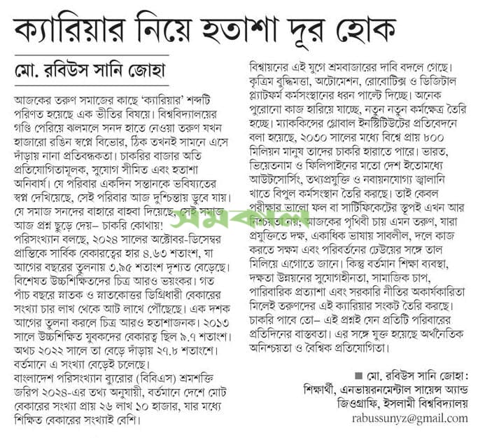কিন্তু সময় বদলেছে, প্রজন্ম বদলেছে, বদলেছে সমাজ ও রাষ্ট্রের চাহিদা। আজকের তরুণ সমাজের কাছে ‘ক্যারিয়ার’ শব্দটি শুধুই আশার আলো নয় বরং তা পরিণত হয়েছে এক ভীতিকর শব্দে। বিশ্ববিদ্যালয়ের গণ্ডি পেরিয়ে ঝলমলে সনদ হাতে নেওয়া তরুণ যখন হাজারো রঙিন স্বপ্নে বিভোর,ঠিক তখনই সামনে এসে দাঁড়ায় বন্ধ কপাট। চাকরির বাজার অতি প্রতিযোগিতামূলক, সুযোগ সীমিত এবং হতাশা অনিবার্য।যে পরিবার একদিন সন্তানকে ভবিষ্যতের স্বপ্ন দেখিয়েছে,সেই পরিবার আজ দুশ্চিন্তায় ডুবে যায়। যে সমাজ সনদের বাহারে বাহবা দিয়েছে, সেই সমাজ আজ প্রশ্ন ছুঁড়ে দেয়- চাকরি কোথায়?