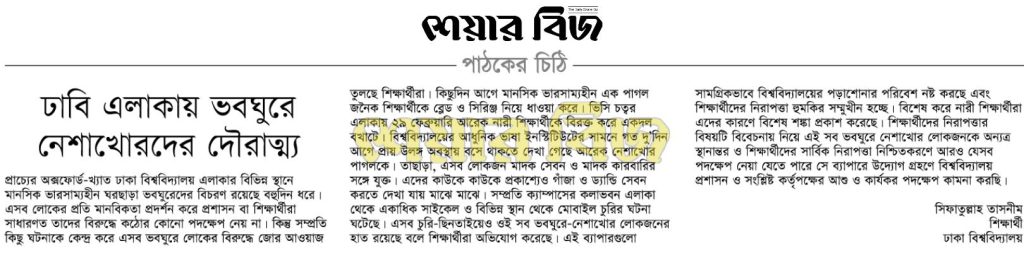 এই ব্যাপারগুলো সামগ্রিকভাবে বিশ্ববিদ্যালয়ের পড়াশোনার পরিবেশ নষ্ট করছে এবং শিক্ষার্থীদের নিরাপত্তা হুমকির সম্মুখীন হচ্ছে। বিশেষ করে নারী শিক্ষার্থীরা এদের কারণে বিশেষ শঙ্কা প্রকাশ করেছে। শিক্ষার্থীদের নিরাপত্তার বিষয়টি বিবেচনায় নিয়ে এই সব ভবঘুরে নেশাখোর লোকজনকে অন্যত্র স্থানান্তর ও শিক্ষার্থীদের সার্বিক নিরাপত্তা নিশ্চিতকরণে আরও যেসব পদক্ষেপ নেয়া যেতে পারে সে ব্যাপারে উদ্যোগ গ্রহণে বিশ্ববিদ্যালয় প্রশাসন ও সংশ্লিষ্ট কর্তৃপক্ষের আশু ও কার্যকর পদক্ষেপ কামনা করছি।