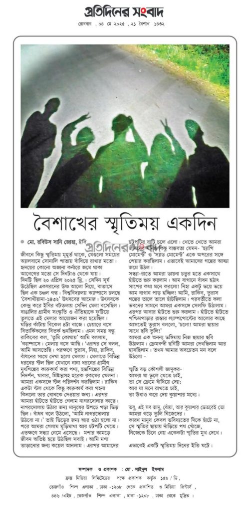 দিনটি ছিল ২০ এপ্রিল ২০২৫ খ্রি.। সেদিন সূর্য উঠেছিল এক ধরনের উষ্ণ আলো নিয়ে, বাতাসে ছিল এক চঞ্চল গন্ধ। বিশ্ববিদ্যালয় ক্যাম্পাসে চলছে ‘বৈশাখীয়ানা-১৪৩২’উৎসবের আমেজ। উৎসবকে কেন্দ্র করে ইবির বটতলায় সেদিন মেলা বসেছিল। বাঙালির গ্রামীন সংস্কৃতি ও ঐতিহ্যকে ফুটিয়ে তুলতে এই মেলার আয়োজন করা হয়েছিল।