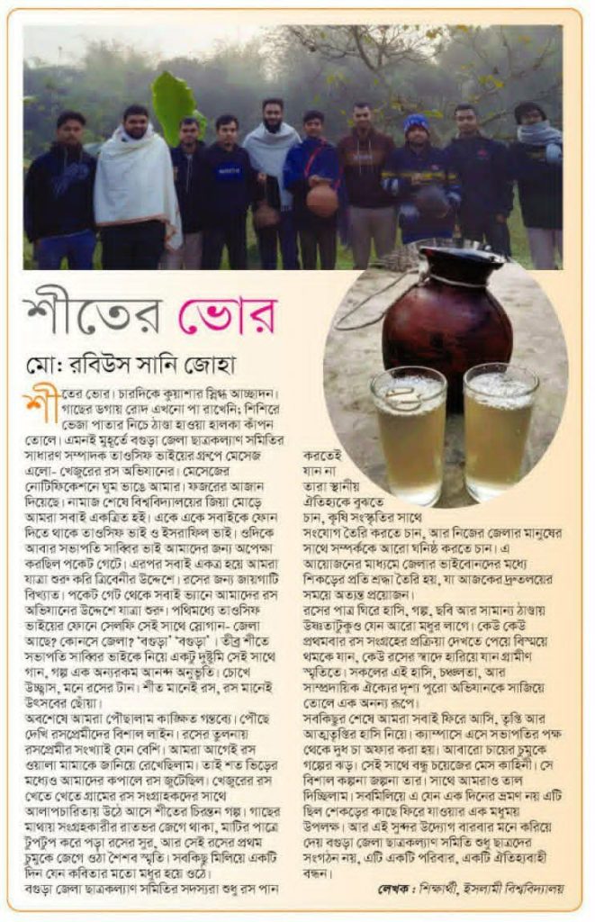 পকেট গেইট থেকে সকলে ভ্যানে করে আমাদের রস অভিযান এর উদ্দেশ্যে যাত্রা শুরু। পথিমধ্যে তাওসিফ ভাইয়ের ফোনে সেলফি সেই সাথে স্লোগান – জেলা আছে? কোনসে জেলা? ‘বগুড়া’ ‘বগুড়া’ । তীব্র শীতে সভাপতি সাব্বির ভাইকে নিয়ে একটু দুষ্টুমি সেই সাথে গান, গল্প এক অন্যরকম আনন্দ অনুভূতি। চোখে উচ্ছ্বাস, মনে রসের টান। শীত মানেই রস, রস মানেই উৎসবের ছোঁয়া।