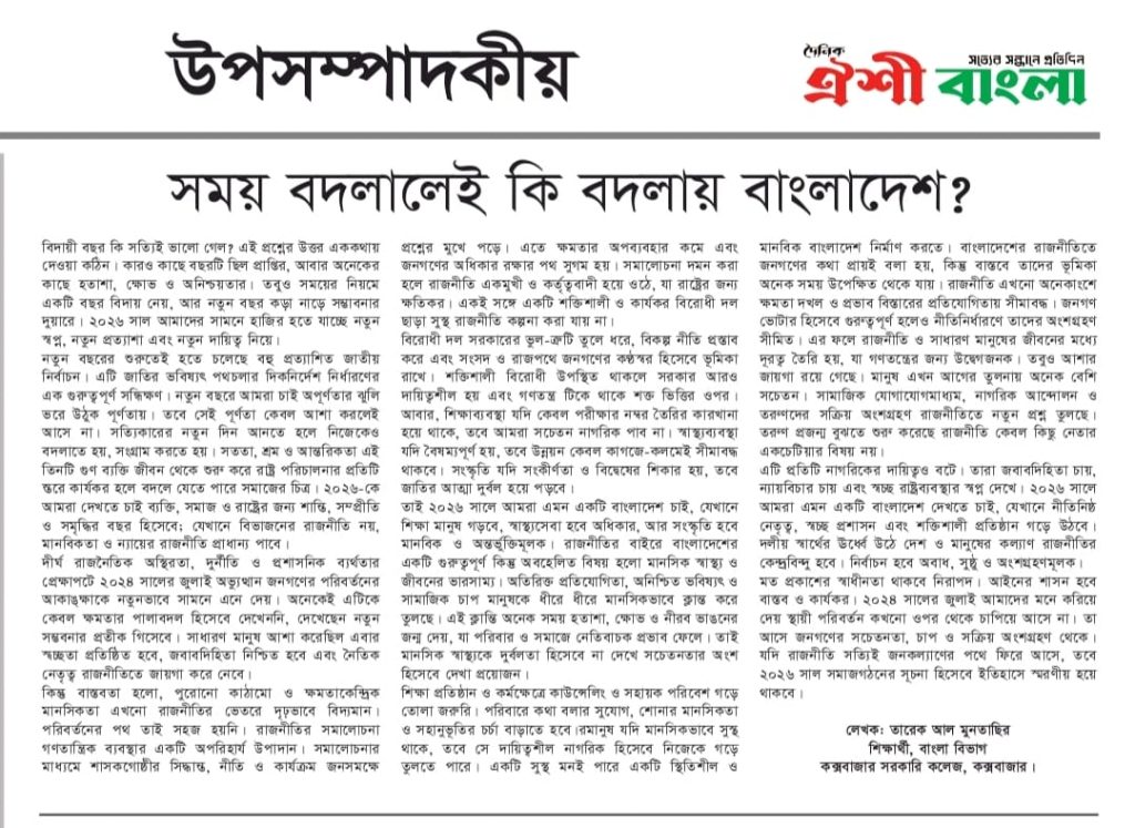 ২০২৬ সালে আমরা এমন একটি বাংলাদেশ দেখতে চাই, যেখানে নীতিনিষ্ঠ নেতৃত্ব, স্বচ্ছ প্রশাসন এবং শক্তিশালী প্রতিষ্ঠান গড়ে উঠবে। দলীয় স্বার্থের ঊর্ধ্বে উঠে দেশ ও মানুষের কল্যাণ রাজনীতির কেন্দ্রবিন্দু হবে। নির্বাচন হবে অবাধ, সুষ্ঠু ও অংশগ্রহণমূলক। মত প্রকাশের স্বাধীনতা থাকবে নিরাপদ। আইনের শাসন হবে বাস্তব ও কার্যকর। ২০২৪ সালের জুলাই আমাদের মনে করিয়ে দেয় স্থায়ী পরিবর্তন কখনো ওপর থেকে চাপিয়ে আসে না। তা আসে জনগণের সচেতনতা, চাপ ও সক্রিয় অংশগ্রহণ থেকে। যদি রাজনীতি সত্যিই জনকল্যাণের পথে ফিরে আসে, তবে ২০২৬ সাল সমাজগঠনের সূচনা হিসেবে ইতিহাসে স্মরণীয় হয়ে থাকবে।