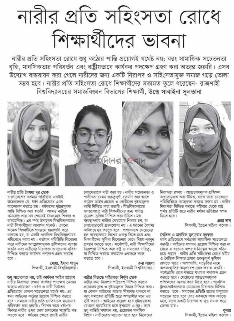 হোম / ফিচার / নিবন্ধনারীর প্রতি সহিংসতা রোধে শিক্ষার্থীদের ভাবনা মোছাঃ ইসমা খাতুন , ইসলামী বিশ্ববিদ্যালয়, কুষ্টিয়া প্রকাশ: ৬ এপ্রিল ২০২৫ পাঠ: ৫২ বার নারীর প্রতি বৈষম্য দূর হোকলেখক: কার্যনির্বাহী সদস্য, ইসলামী বিশ্ববিদ্যালয়।এই লেখাটি ৬ এপ্রিল ২০২৫ তারিখে প্রতিদিনের সংবাদ পত্রিকায় প্রকাশিত। লেখাটি শেয়ার করুন: