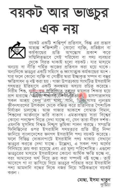হোম / খোলা চিঠি / নিবন্ধবয়কট আট ভাঙচুর এক নয় মোছাঃ ইসমা খাতুন , ইসলামী বিশ্ববিদ্যালয়, কুষ্টিয়া প্রকাশ: ১৯ এপ্রিল ২০২৪ পাঠ: ৪০ বার বয়কট ও ভাঙচুরলেখক: কার্যনির্বাহী সদস্য, ইসলামী বিশ্ববিদ্যালয়।এই লেখাটি ১৯ এপ্রিল ২০২৪ তারিখে দৈনিক জনকণ্ঠ পত্রিকায় প্রকাশিত। লেখাটি শেয়ার করুন: