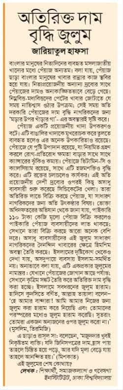 পেঁয়াজ একটি প্রয়োজনীয় খাদ্য উপকরণও বটে। এটি বাঙালির খাদ্যকে মুখরোচক করে তুলতে ব্যবহৃত হলেও এর অনেক উপকারিতাও রয়েছে। পেঁয়াজে যে পুষ্টি উপাদান রয়েছে, যা নিয়মিত গ্রহণ করলে রোগ-প্রতিরোধ ক্ষমতা বাড়ার সাথে সাথে ক্যান্সারের ঝুঁকিও কমায়। পেঁয়াজে ভিটামিন-সি ও ক্যালসিয়াম রয়েছে, সাথে এটি হজমশক্তিও বৃদ্ধি করে। এটি রক্তের চলাচলেও কার্যকর। এই অতি প্রয়োজনীয় দেশী দ্রব্যের ওপরই কিছু অসাধু ব্যবসায়ী শুরু করেছে সিন্ডিকেটের খেলা। তারা অতিরিক্ত লাভে বিক্রি করছে পেঁয়াজ, যা সাধারণ নাগরিকদের জন্য অতি উৎকণ্ঠার বিষয়। ভোক্তা অধিদফতরের অভিযান থেকে জানা যায়, পাইকারি ১১০ টাকা কেজি মূল্যে পেঁয়াজ বিক্রি করলেও পাইকারি পেঁয়াজ ব্যবসায়ীদের লাভ থাকছে: সেখানে তারা বিক্রি করছে আরো অনেক বেশি দরে। অসাধু ব্যবসায়ীদের এই জুলুম সাধারণ নাগরিকদের দৈনন্দিন খাবারের ক্ষেত্রে হিমশিম অবস্থা তৈরি করছে। ইসলামের দৃষ্টিকোণ থেকেও দেখা যায়, অসদুপায়ে ব্যবসায় ইসলাম-সমর্থিত নয়। অন্যভাবে বলা যায়, এটি একপ্রকার জুলুমের নামান্তর। যেখানে পেঁয়াজের জোগান আছে পর্যাপ্ত; সেখানে কৃত্রিম সঙ্কট তৈরি করে অতিরিক্ত দাম বৃদ্ধি করা হচ্ছে। ইসলামে সবধরনের জুলুম হারাম। হাদিসে কুদসিতে বর্ণিত, আল্লাহ তায়ালা বলেন-‘হে আমার বান্দারা! আমি আমার নিজের জন্য জুলুম করা হারাম করে নিয়েছি এবং তোমাদের পরস্পরের মধ্যেও জুলুম হারাম করেছি। সুতরাং তোমরা একজন অন্যজনের ওপর জুলুম করো না।’ (মুসলিম, তিরমিজি)