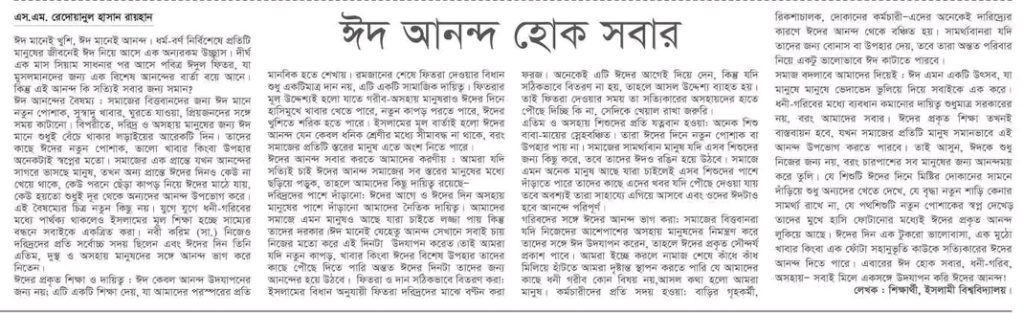 হোম / কলাম/মতামত / নিবন্ধঈদ আনন্দ হোক সবার এস এম রেদোয়ানুল হাসান , ইসলামী বিশ্ববিদ্যালয় প্রকাশ: ৫ সেপ্টেম্বর ২০২৫ পাঠ: ৫০ বার লেখক: প্রশিক্ষণ বিষয়ক সম্পাদক, ইসলামী বিশ্ববিদ্যালয় শাখা।এই লেখাটি ৫ সেপ্টেম্বর ২০২৫ তারিখে দৈনিক জবাবদিহি পত্রিকায় প্রকাশিত। লেখাটি শেয়ার করুন: