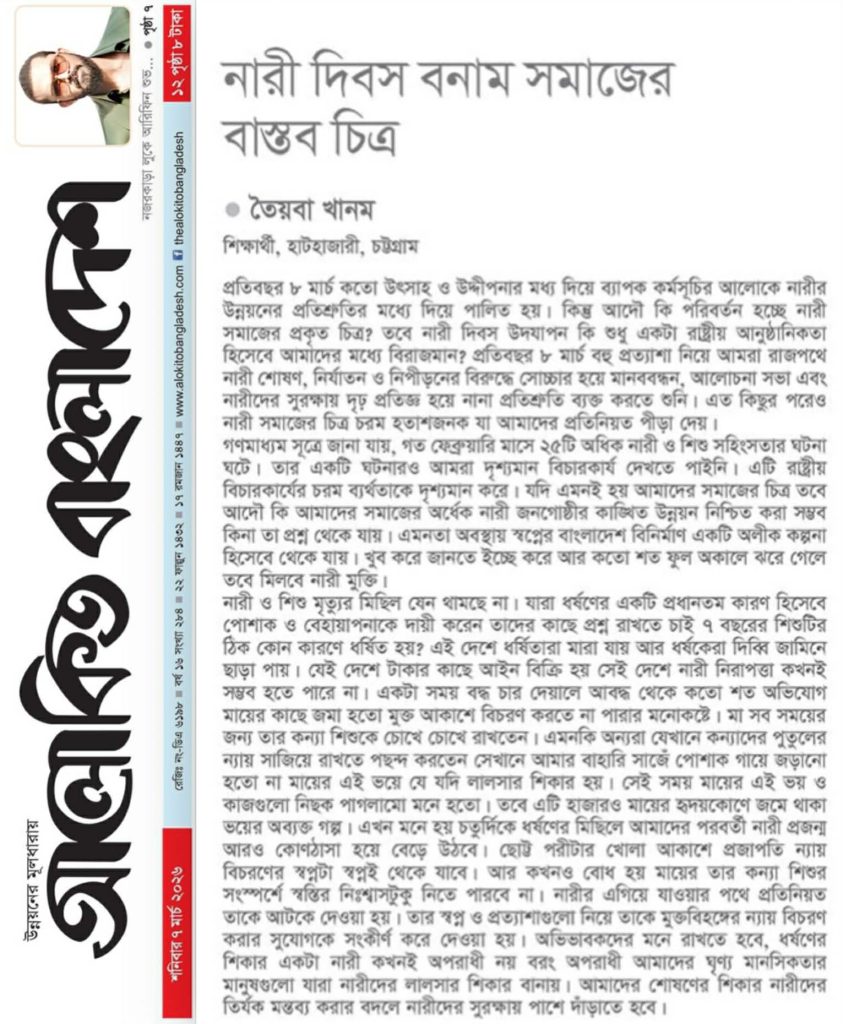 হোম / কলাম/মতামত / নিবন্ধনারী দিবস বনাম সমাজের বাস্তব চিত্র তৈয়বা খানম , চট্টগ্রাম কলেজ প্রকাশ: ৫ মার্চ ২০২৬ পাঠ: ৬১ বার …লেখক: সদস্য, জাতীয় বিশ্ববিদ্যালয়।এই লেখাটি ৫ মার্চ ২০২৬ তারিখে আলোকিত বাংলাদেশ পত্রিকায় প্রকাশিত। লেখাটি শেয়ার করুন: