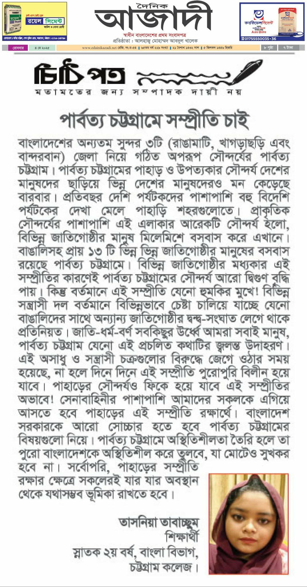বাংলাদেশের অন্যতম সুন্দর ৩টি (রাঙামাটি, খাগড়াছড়ি এবং বান্দরবান) জেলা নিয়ে গঠিত অপরূপ সৌন্দর্যের পার্বত্য চট্টগ্রাম। পার্বত্য চট্টগ্রামের পাহাড় ও উপত্যকার সৌন্দর্য দেশের মানুষদের ছাড়িয়ে ভিন্ন দেশের মানুষদেরও মন কেড়েছে বারবার। প্রতিবছর দেশি পর্যটকদের পাশাপাশি বহু বিদেশি পর্যটকের দেখা মেলে পাহাড়ি শহরগুলোতে। প্রাকৃতিক সৌন্দর্যের পাশাপাশি এই এলাকার আরেকটি সৌন্দর্য হলো, বিভিন্ন জাতিগোষ্ঠীর মানুষ মিলেমিশে বসবাস করে এখানে। বাঙালিসহ প্রায় ১৩ টি ভিন্ন ভিন্ন জাতিগোষ্ঠীর মানুষের বসবাস রয়েছে পার্বত্য চট্টগ্রামে। বিভিন্ন জাতিগোষ্ঠীর মধ্যকার এই সম্প্রীতির কারণেই পার্বত্য চট্টগ্রামের সৌন্দর্য আরো দ্বিগুণ বৃদ্ধি পায়। কিন্তু বর্তমানে এই সম্প্রীতি যেনো হুমকির মুখে! বিভিন্ন সন্ত্রাসী দল বর্তমানে বিভিন্নভাবে চেষ্টা চালিয়ে যাচ্ছে যেনো বাঙালিদের সাথে অন্যান্য জাতিগোষ্ঠীর দ্বন্দ্ব-সংঘাত লেগে থাকে প্রতিনিয়ত। জাতি-ধর্ম-বর্ণ সবকিছুর উর্ধ্বে আমরা সবাই মানুষ, পার্বত্য চট্টগ্রাম যেনো এই প্রচলিত কথাটির জ্বলন্ত উদাহরণ। এই অসাধু ও সন্ত্রাসী চক্রগুলোর বিরুদ্ধে জেগে ওঠার সময় হয়েছে, না হলে দিনে দিনে এই সম্প্রীতি পুরোপুরি বিলীন হয়ে যাবে। পাহাড়ের সৌন্দর্যও ফিকে হয়ে যাবে এই সম্প্রীতির অভাবে! সেনাবাহিনীর পাশাপাশি আমাদের সকলকে এগিয়ে আসতে হবে পাহাড়ের এই সম্প্রীতি রক্ষার্থে। বাংলাদেশ সরকারকে আরো সোচ্চার হতে হবে পার্বত্য চট্টগ্রামের বিষয়গুলো নিয়ে। পার্বত্য চট্টগ্রামে অস্থিতিশীলতা তৈরি হলে তা পুরো বাংলাদেশকে অস্থিতিশীল করে তুলবে, যা মোটেও সুখকর হবে না। সর্বোপরি, পাহাড়ের সম্প্রীতি রক্ষার ক্ষেত্রে সকলেরই যার যার অবস্থান থেকে যথাসম্ভব ভূমিকা রাখতে হবে।