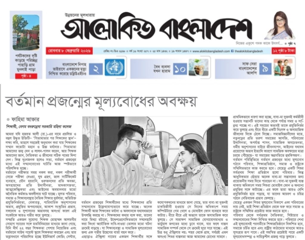 সম্প্রতি একজন সুযোগ্য শিক্ষক মোহাম্মদ আলমগীর সোহাগ স্যারের সঙ্গে মতবিনিময়ের মাধ্যমে জানা গেছে, যিনি দীর্ঘ ২২ বছর শিক্ষকতা পেশায় নিয়োজিত এবং বর্তমানে সাউথ পয়েন্ট স্কুলে শিক্ষকতা করছেন—এবং তাঁর তত্ত্বাবধানে পরিচালিত হচ্ছে ইউনিভার্স কোচিং সেন্টার—বর্তমান প্রজন্মের শিক্ষার্থীদের মধ্যে শিক্ষকদের প্রতি সম্মানবোধ উল্লেখযোগ্যভাবে কমে যাচ্ছে। অনেক শিক্ষার্থী আজ শিক্ষকের মর্যাদা ও অবদানকে যথাযথভাবে উপলব্ধি করছে না। শিক্ষকদের কথার ব্যঙ্গ করা, তাঁদের নামে মিথ্যা রটানো, উদ্দেশ্যপ্রণোদিতভাবে সম্মানহানি করা কিংবা অযৌক্তিক দাবি–দাওয়া তোলার মতো ঘটনা ক্রমেই বাড়ছে। যা শিক্ষাব্যবস্থা ও সামাজিক মূল্যবোধের জন্য এক গভীর উদ্বেগের বার্তা বহন করে।