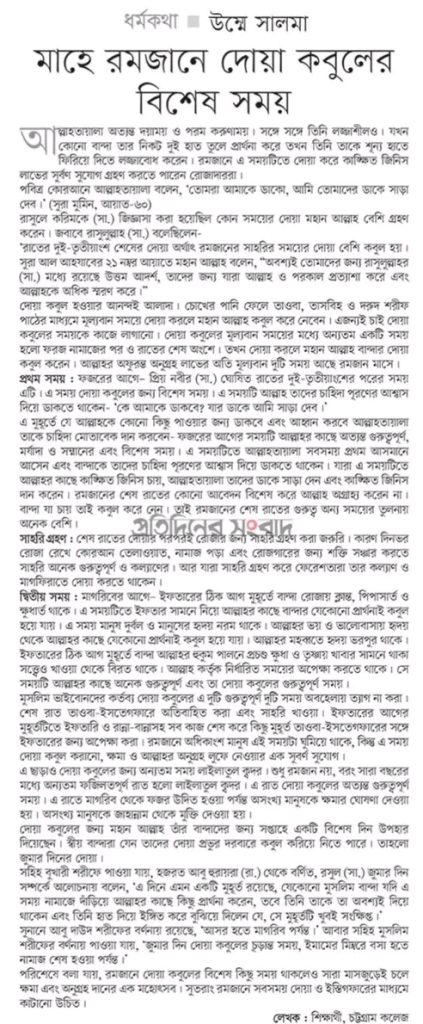দোয়া কবুল হওয়ার আনন্দই আলাদা। চোখের পানি ফেলে তাওবা, তাসবিহ ও দরুদ শরীফ পাঠের মাধ্যমে মূল্যবান সময়ে দোয়া করলে মহান আল্লাহ কবুল করে নেবেন। এজন্যই চাই দোয়া কবুলের সময়কে কাজে লাগানো। দোয়া কবুলের মূল্যবান সময়ের মধ্যে অন্যতম একটি সময় হলো ফরজ নামাজের পর ও রাতের শেষ অংশে। তখন দোয়া করলে মহান আল্লাহ বান্দার দোয়া কবুল করেন। আল্লাহর অফুরন্ত অনুগ্রহ লাভের অতি মূল্যবান দুটি সময় আছে রমজান মাসে।
