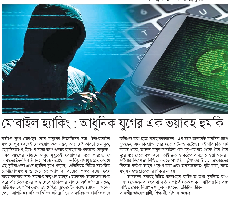 বর্তমান যুগে মোবাইল ফোন মানুষের নিত্যদিনের সঙ্গী। ইন্টারনেটের মাধ্যমে খুব সহজেই যোগাযোগ করা সম্ভব, আর সেই কারণে ফেসবুক, হোয়াটসঅ্যাপ, ইমোর মতো অ্যাপগুলোর ব্যবহার ব্যাপকভাবে বৃদ্ধি পেয়েছে। এসব অ্যাপের মাধ্যমে মানুষ মুহূর্তেই খবরাখবর নিতে পারছে, যা আমাদের দৈনন্দিন জীবনকে সহজ করেছে। কিন্তু কিছু অসাধু চক্রের কারণে এই সুবিধাগুলো এখন হুমকির মুখে পড়েছে। প্রতিনিয়ত বিভিন্ন সামাজিক যোগাযোগমাধ্যম ও ম্যাসেজিং অ্যাপ হ্যাকিংয়ের শিকার হচ্ছে, ফলে ব্যবহারকারীরা নানা সমস্যার সম্মুখীন হচ্ছেন। হ্যাকাররা অ্যাকাউন্ট হ্যাক করে পরিচিতজনদের কাছ থেকে প্রতারণার মাধ্যমে অর্থ হাতিয়ে নিচ্ছে, ব্যক্তিগত তথ্য ফাঁস করার ভয় দেখিয়ে ব্ল্যাকমেইল করছে। এমনকি অনেক ক্ষেত্রে আপত্তিকর ছবি ও ভিডিও ছড়িয়ে দিয়ে সামাজিক ও মানসিকভাবে ক্ষতিগ্রস্ত করা হচ্ছে ব্যবহারকারীদের। এর ফলে অনেকেই মানসিক চাপে ভুগছেন, এমনকি প্রাণনাশের মতো ঘটনাও ঘটেছে। এই পরিস্থিতি যদি চলতে থাকে, তাহলে মানুষ সামাজিক যোগাযোগমাধ্যম থেকে ধীরে ধীরে দূরে সরে যেতে বাধ্য হবে। তাই দ্রুত ও কঠোর ব্যবস্থা নেওয়া জরুরি। সাইবার নিরাপত্তা নিশ্চিত করতে সংশ্লিষ্ট কর্তৃপক্ষের উচিত হ্যাকারদের বিরুদ্ধে কঠোর আইন প্রয়োগ করা এবং জনসচেতনতা বৃদ্ধি করা, যাতে মানুষ সহজে প্রতারণার শিকার না হয়। আমাদের সকলেরই উচিত অনলাইনে ব্যক্তিগত তথ্য সুরক্ষিত রাখা এবং সন্দেহজনক লিংক বা বার্তা সম্পর্কে সতর্ক থাকা। সাইবার নিরাপত্তা নিশ্চিত হোক, নিরাপদ থাকুক আমাদের ডিজিটাল জীবন।