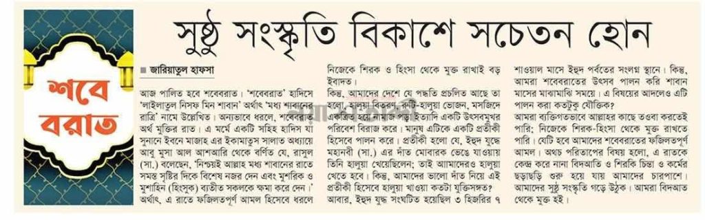 আমরা ব্যক্তিগতভাবে আল্লাহর কাছে তওবা করতেই পারি; নিজেকে শিরক-হিংসা থেকে মুক্ত রাখতে পারি। যেটি হবে আমাদের শবেবরাতের ফজিলতপূর্ণ আমল। অথচ পরিতাপের বিষয় হলো, এ রাতকে কেন্দ্র করে নানা বিদআতি ও শিরকি চিন্তা ও কর্মের ছড়াছড়ি শুরু হয়ে যায় আমাদের চারপাশে। আমাদের সুষ্ঠু সংস্কৃতি গড়ে উঠুক। আমরা বিদআত থেকে মুক্ত হই।