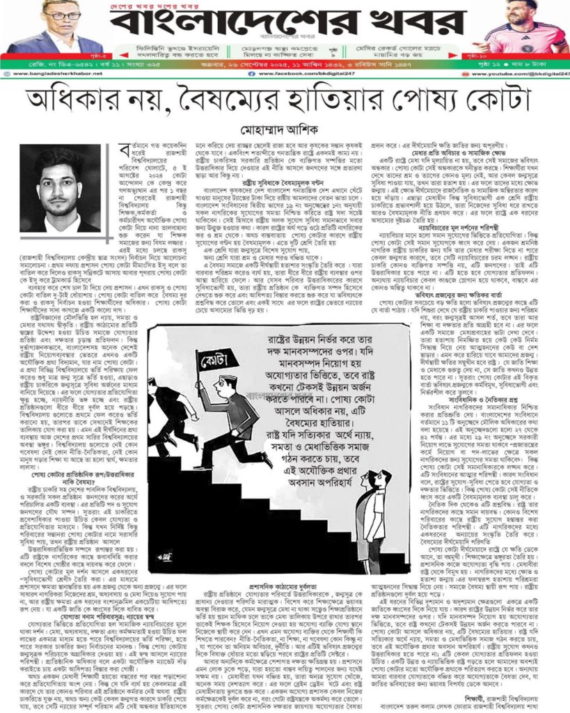 রাষ্ট্রবিজ্ঞানের মৌলভিত্তি হল ন্যায়, সমতা ও মেধার যথাযথ স্বীকৃতি। রাষ্ট্রীয় কাঠামোর প্রতিটি স্তম্ভের উদ্দেশ্য হওয়া উচিত সমাজে যোগ্যতার প্রতিষ্ঠা এবং দক্ষতার চূড়ান্ত প্রতিফলন। কিন্তু দুর্ভাগ্যজনকভাবে, বাংলাদেশসহ অনেক দেশেই রাষ্ট্রীয় নিয়োগব্যবস্থার ভেতরে এখনও একটি অযৌক্তিক প্রথা বিদ্যমান, যার নাম পোষ্য কোটা। এ প্রথা বিভিন্ন বিশ্ববিদ্যালয়ে ভর্তি পরিক্ষায় ফেল করেও শুধু মাত্র জন্ম সুত্রে ভর্তি হওয়া, এছাড়াও রাষ্ট্রীয় চাকরিকে জন্মসূত্রে সুবিধা অর্জনের মাধ্যম বানিয়ে দিয়েছে। এর ফলে যোগ্যতার প্রতিযোগিতা ক্ষুণ্ণ হচ্ছে, ন্যায়নীতি ভঙ্গ হচ্ছে এবং রাষ্ট্রীয় প্রতিষ্ঠানগুলো ধীরে ধীরে দুর্বল হয়ে পড়ছে। বিশ্ববিদ্যালয় গুলোতে প্রথমে ফেল করেও ভর্তি করানো হয়, তারপর তাকে সেখানেই শিক্ষকের তালিকায় যোগ করা হয়। এমন এই দীর্ঘদিনের প্রথা ব্যবস্থায় আজ দেশের প্রথম সারির বিশ্ববিদ্যালয়ের অবস্থা ভঙ্গুর। বিশ্ববিদ্যালয় গুলোতে নেই কোন গবেষণা নেই কোন নীতি-নৈতিকতা, নেই কোন মানুষ গড়ার শিক্ষা যা আছে তা হলো স্বার্থ, ক্ষমতার লালসা।