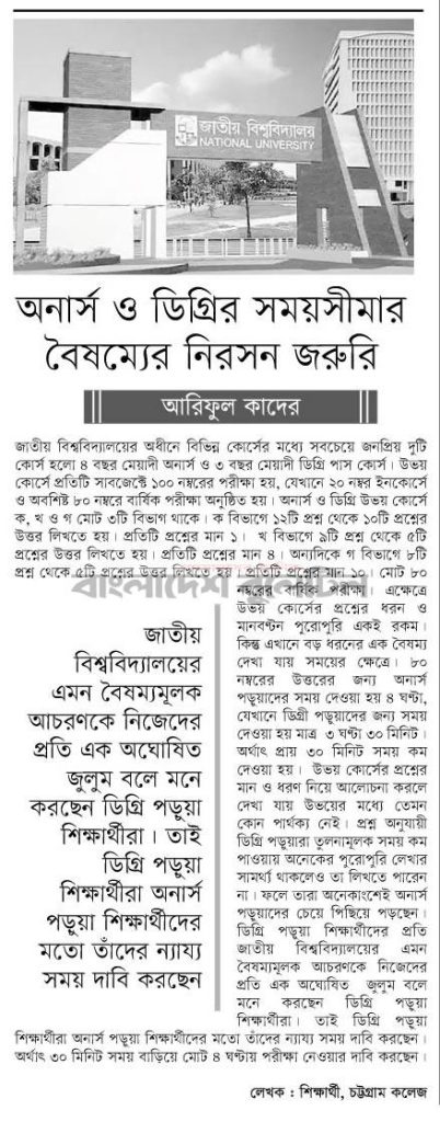 জাতীয় বিশ্ববিদ্যালয়ের অধীনে বিভিন্ন কোর্সের মধ্যে সবচেয়ে জনপ্রিয় দুটি কোর্স হলো ৪ বছর মেয়াদী অনার্স (সম্মান)  ৩ বছর মেয়াদী ডিগ্রি (পাস কোর্স)। উভয় কোর্সে প্রতিটি সাবজেক্টে ১০০ নম্বরের পরীক্ষা হয়, যেখানে ২০ নম্বর ইনকোর্সে ও অবশিষ্ট ৮০ নম্বরে বার্ষিক পরীক্ষা অনুষ্ঠিত হয়। অনার্স ও ডিগ্রি উভয় কোর্সে ক, খ ও গ মোট ৩টি বিভাগ থাকে। ক বিভাগে ১২টি প্রশ্ন থেকে ১০টি প্রশ্নের উত্তর লিখতে হয়। প্রতিটি প্রশ্নের মান ১। খ বিভাগে ৯টি প্রশ্ন থেকে ৫টি প্রশ্নের উত্তর লিখতে হয়। প্রতিটি প্রশ্নের মান ৪। অন্যদিকে গ বিভাগে ৮টি প্রশ্ন থেকে ৫টি প্রশ্নের উত্তর লিখতে হয়। প্রতিটি প্রশ্নের মান ১০। মোট ৮০ নম্বরের বার্ষিক পরীক্ষা। এক্ষেত্রে উভয় কোর্সের প্রশ্নের ধরন ও মানবণ্টন পুরোপুরি একই রকম। কিন্তু এখানে বড় ধরনের এক বৈষম্য দেখা যায় সময়ের ক্ষেত্রে। ৮০ নম্বরের উত্তরের জন্য অনার্স পড়ুয়াদের সময় দেওয়া হয় ৪ ঘণ্টা, যেখানে ডিগ্রী পড়ুয়াদের জন্য সময় দেওয়া হয় মাত্র ৩ ঘণ্টা ৩০ মিনিট। অর্থাৎ প্রায় ৩০ মিনিট সময় কম দেওয়া হয়। উভয় কোর্সের প্রশ্নের মান ও ধরণ নিয়ে আলোচনা করলে দেখা যায় উভয়ের মধ্যে তেমন কোন পার্থক্য নেই। প্রশ্ন অনুযায়ী ডিগ্রি পড়ুয়ারা তুলনামূলক সময় কম পাওয়ায় অনেকের পুরোপুরি লেখার সামর্থ্য থাকলেও তা লিখতে পারেন না। ফলে তারা অনেকাংশেই অনার্স পড়ুয়াদের চেয়ে পিছিয়ে পড়ছেন। ডিগ্রি পড়ুয়া শিক্ষার্থীদের প্রতি জাতীয় বিশ্ববিদ্যালয়ের এমন বৈষম্যমূলক আচরণকে নিজেদের প্রতি এক অঘোষিত জুলুম বলে মনে করছেন ডিগ্রি পড়ুয়া শিক্ষার্থীরা। তাই ডিগ্রি পড়ুয়া শিক্ষার্থীরা অনার্স পড়ুয়া শিক্ষার্থীদের মতো তাঁদের ন্যায্য সময় দাবি করছেন। অর্থাৎ ৩০ মিনিট সময় বাড়িয়ে মোট ৪ ঘণ্টায় পরীক্ষা নেওয়ার দাবি করছেন।