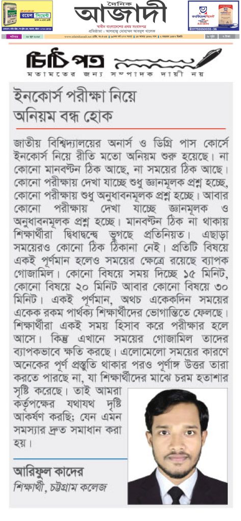 ইনকোর্স পরীক্ষা নিয়ে অনিয়ম বন্ধ হোক