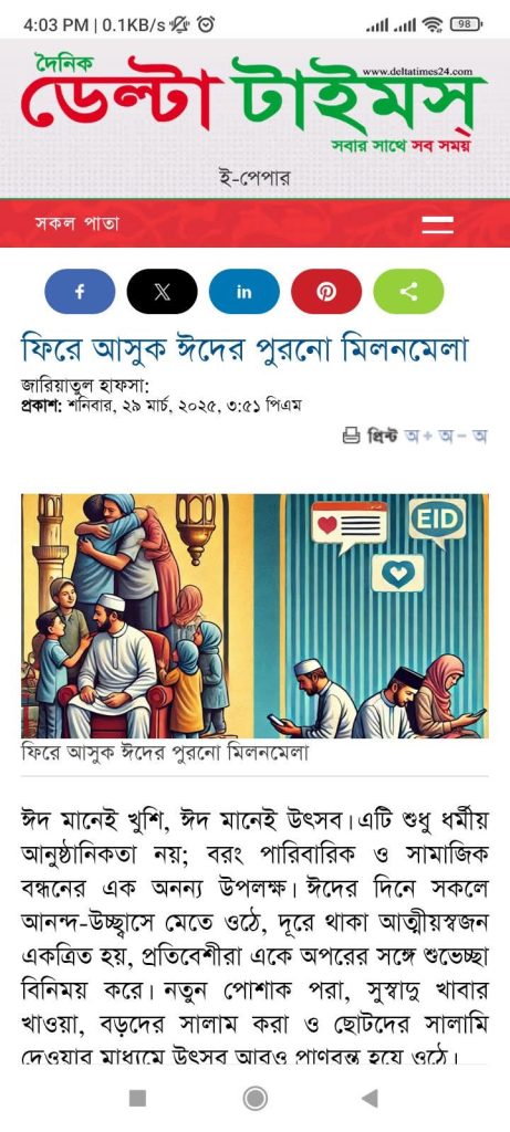প্রযুক্তি আমাদের জীবনের অংশ, কিন্তু তা যেন আন্তরিকতা ও সম্পর্কের উষ্ণতা নষ্ট না করে। ঈদ হোক একতার উৎসব, মিলনের প্রতীক। নতুন প্রযুক্তির সঙ্গে পুরনো আবেগের সেতুবন্ধন তৈরি করাই হোক আমাদের লক্ষ্য। আবারও ফিরুক পুরনো মিলনমেলা।