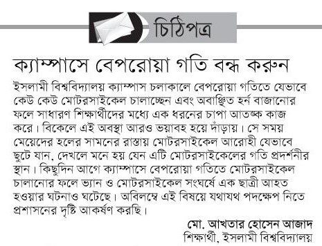 বিশ্ববিদ্যালয় জ্ঞানচর্চার উন্মুক্ত ময়দান হলেও ইসলামী বিশ্ববিদ্যালয় যেন দুরন্ত গতিতে মোটর সাইকেল চালনার প্রতিযোগিতার ময়দানে পরিণত হয়েছে। ক্যাম্পাস চলাকালীন সময়ে বেপরোয়া গতিতে যেভাবে কেউ কেউ মোটর সাইকেল চালাচ্ছেন এবং অবাঞ্চিত হর্ণ বাজানোর ফলে সাধারণ শিক্ষার্থীদের মধ্যে এক প্রকার চাপা আতঙ্ক কাজ করে। বিকালে এই অবস্থা আরো ভয়াবহ হয়ে দাঁড়ায়। সে সময় মেয়েদের হলের সামনের রাস্তায় মোটর সাইকেলের আরোহী যেভাবে ছুটে যান, দেখলে মনে হয় যেন এটি মোটর সাইকেলের গতি প্রদর্শনীর স্থান। কিছুদিন আগে ক্যাম্পাসে বেপরোয়া গতিতে মোটর সাইকেল চালানোর ফলে ভ্যান ও মোটর সাইকেল সংঘর্ষে এক ছাত্রী আহত হবার ঘটনাও ঘটেছে।