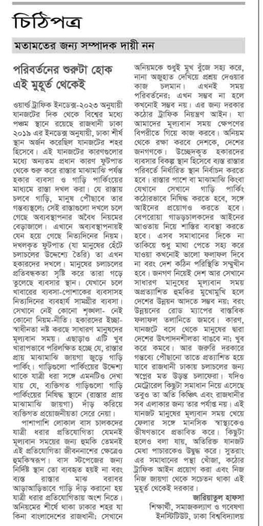 অনিয়মকে শুধুই মুখ বুজে সহ্য করে, নানা অজুহাত দেখিয়ে প্রশ্রয় দেওয়ার কাজ চলমান। এখনই সময় পরিবর্তনের; এখন সম্ভব না হলে কখনোই সম্ভব নয়। এর জন্য দরকার কঠোর ট্রাফিক নিয়ন্ত্রণ আইন। যা আমাদের মূল্যবান সময় ক্ষেপণের বিপরীতে গিয়ে কাজ করবে। অনিয়ম থেকে রক্ষা করবে দেশকে, দেশের জনগণকে। উচ্ছেদকৃত হকারদের ব্যবসার বিকল্প স্থান হিসেবে ব্যস্ত রাস্তার পরিবর্তে নির্ধারিত স্থান নির্বাচন করতে হবে। রাস্তার পাশে বা মাঝামাঝি কিংবা যেখানে সেখানে গাড়ি পার্কিং কঠোরভাবে নিষিদ্ধ করতে হবে, সঙ্গে আইনের প্রয়োগও করতে হবে। বেপরোয়া গাডড়চালকদের আইনের আওতায় নিয়ে শাস্তির ব্যবস্থা করতে হবে। এসব সমাধানের দিকে না তাকিয়ে শুধু মাথা পেতে সহ্য করে যাওয়া কখনোই ভালো ফলাফল দিবে না বরং দেশ কঠিন পরিস্থিতি সম্মুখীন হবে। জনগণ নিয়েই দেশ আর সেখানে সাধারণ মানুষের মূল্যবান সময় অপ্রত্যাশিত হুমকির মুখোমুখি হলে দেশের উন্নয়ন আদতে সম্ভব নয়; বরং উন্নয়নের রোড ম্যাপের বাস্তবিক ফলাফল তলানিতে জমবে। কারণ, যানজটে বসে থেকে মানুষের দ্বারা দেশের উৎপাদনশীলতা বাঙবে না; খুব করে কমবে। আর জরুরি দরকারে গন্তব্যে পৌঁছানো তাতে প্রত্যাশিত হয়ে যাবে রাজধানী ঢাকায় চলাচলের জন্য স্বপ্নের মত উড়ন্ত চলাফেরা। যদিও মেট্রোরেল কিছুটা সমাধান নিয়ে এসেছে তবুও তা অতি কিঞ্চিৎ এবং রাজধানীর সব এলাকার জন্য তার পর্যাপ্ত নয়। এই যানজট মানুষের মূল্যবান সময় খেয়ে ফেলার সঙ্গে মানসিক স্বাস্থ্যকেও ভীষণভাবে প্রভাবিত করে। কিছুটা হলেও বলা যায়, অতিরিক্ত যানজট মেধা পাচারকেও কও উদ্বুদ্ধ করে। সুতরাং এর সমাধানের পন্থা খোঁজা, কঠোর ট্রাফিক আইন প্রয়োগ করা এবং নিজ নিজ জায়গা থেকে সচেতন থাকা এই মুহূর্ত থেকেই দরকার।