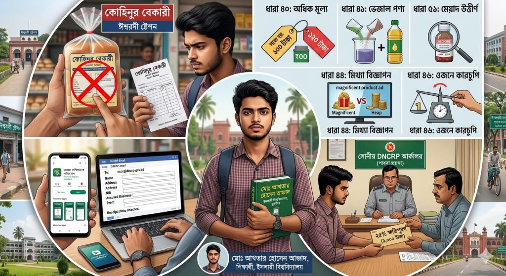 কিছুদিন আগে আমি পাবনার ঈশ্বরদী স্টেশনে কোহিনুর বেকারীর একটি পাউরুটি কিনি। তা খেয়ে পেটব্যাথা অনুভব করলে মোড়ক লক্ষ্য করে দেখতে পাই তাতে উৎপাদনের তারিখ, মেয়াদ উত্তীর্ণের তারিখ এবং মূল্য উল্লেখ করা নাই। এরপর আমি জাতীয় ভোক্তা অধিকার সংরক্ষণ অধিদপ্তরে ইমেইলের মাধ্যমে অভিযোগ করি। এক সপ্তাহ পরে ভোক্তা অধিকার সংরক্ষণ অধিদপ্তরের পাবনা কার্যালয়ে আমার ও উক্ত বেকারীর মালিকের উপস্থিতিতে শুনানি অনুষ্ঠিত হয়। তিনি দোষ স্বীকার করেন এবং এরপর থেকে পণ্যে সকল তথ্য সংযোজন করবেন এমন প্রতিশ্রুতি দিলে ভোক্তা অধিকার সংরক্ষণ অধিদপ্তরের সহকারী পরিচালক ৪ হাজার টাকা জরিমানা করেন এবং ভোক্তা অধিকার আইন অনুযায়ী অভিযোগকারীকে মোট জরিমানার ২৫ শতাংশ প্রদান করার বিধি থাকায় আমাকে ১ হাজার টাকা প্রদান করা হয়।