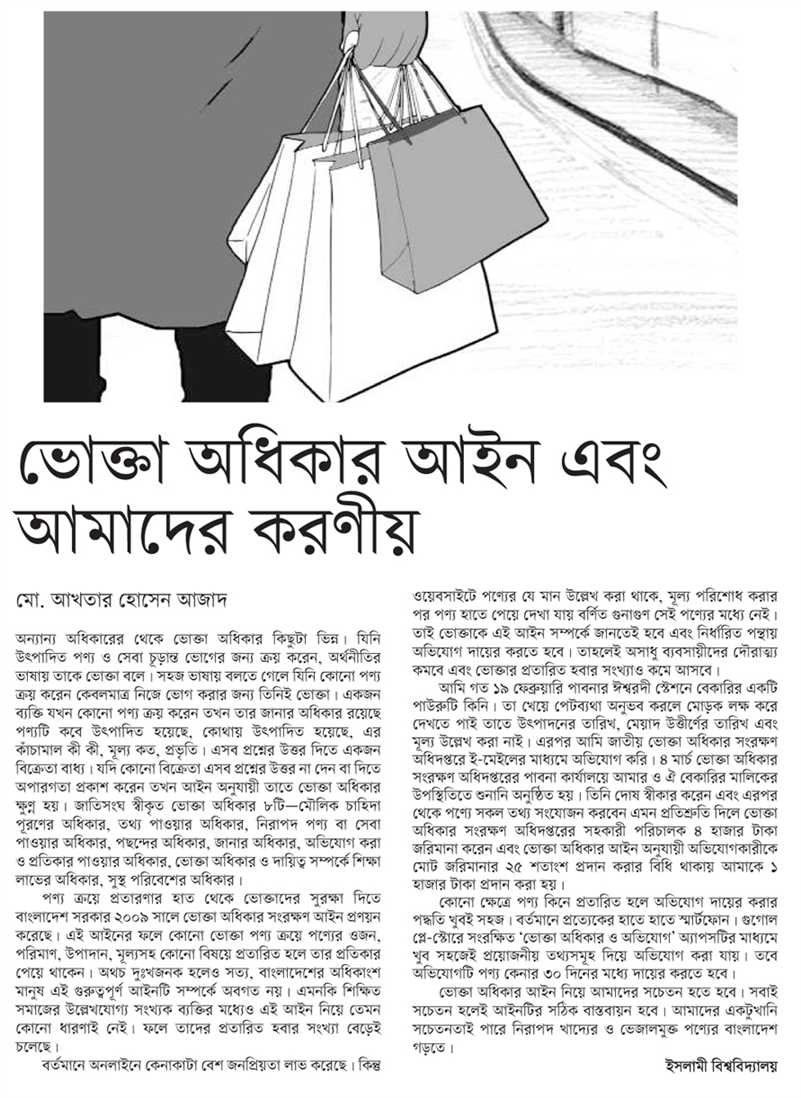 পণ্য ক্রয়ে প্রতারণার হাত থেকে ভোক্তাদের সুরক্ষা দিতে বাংলাদেশ সরকার ২০০৯ সালে বহুল প্রতিক্ষীত ভোক্তা অধিকার সংরক্ষণ আইন প্রণয়ন করেছে। এই আইনের ফলে কোন ভোক্তা পণ্য ক্রয়ে পণ্যের ওজন, পরিমান, উপাদান, মূল্যসহ কোন বিষয়ে প্রতারিত হলে তার প্রতিকার পেয়ে থাকেন। অথচ দুঃখজনক হলেও সত্য বাংলাদেশের অধিকাংশ মানুষ এই গুরুত্বপূর্ণ আইনটি সম্পর্কে অবগত নয়। এমনকি শিক্ষিত সমাজের উল্লেখযোগ্য সংখ্যক ব্যক্তির মধ্যেও এই আইন নিয়ে তেমন কোন ধারণায় নেই। এই আইন সম্পর্কে কোন ধারণা না থাকার দরুণ তাদের প্রতারিত হবার সংখ্যা বেড়েই চলেছে। বর্তমানে অনলাইনে কেনাকাটা বেশ জনপ্রিয়তা লাভ করেছে। কিন্তু ওয়েবসাইটে পণ্যের যে মান উল্লেখ করা থাকে, মূল্য পরিশোধ করার পর পণ্য হাতে পেয়ে দেখা যায় বর্ণিত গুনাগুণ সেই পণ্যের মধ্যে নেই। তাই ভোক্তাকেই এই আইন সম্পর্কে জানতে হবে এবং নির্ধারিত পন্থায় অভিযোগ দায়ের করতে হবে। তাহলেই অসাধু ব্যবসায়ীদের দৌরাত্ম কমবে এবং ভোক্তার প্রতারিত হবার সংখ্যাও কমে আসবে।