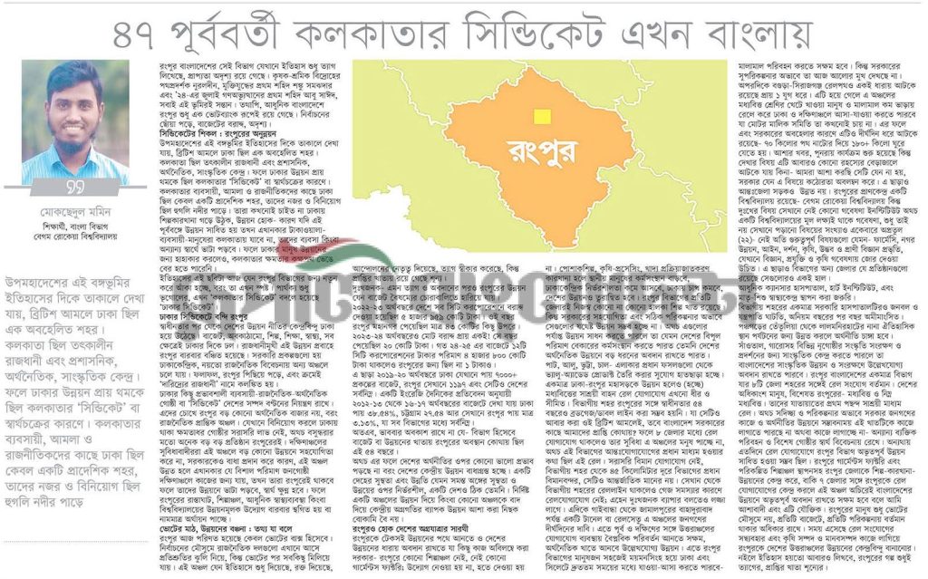 সিন্ডিকেটের শিকল: রংপুরের অনুন্নয়ন: উপমহাদেশর এই বঙ্গভূমির ইতিহাসের দিকে তাকালে দেখা যায়, ব্রিটিশ আমলে ঢাকা ছিল এক অবহেলিত শহর। কলকাতা ছিল তৎকালীন রাজধানী এবং প্রশাসনিক, অর্থনৈতিক, সাংস্কৃতিক কেন্দ্র। ফলে ঢাকার উন্নয়ন প্রায় থমকে ছিল কলকাতার “সিন্ডিকেট” বা স্বার্থচক্রের কারণে। কলকাতার ব্যবসায়ী, আমলা ও রাজনীতিকদের কাছে ঢাকা ছিল কেবল একটি প্রাদেশিক শহর তাদের নজর ও বিনিয়োগ ছিল হুগলি নদীর পাড়ে। তারা কখনোই চাইতোনা ঢাকায় শিল্পকারখানা গড়ে উঠুক, উন্নয়ন হোক- কারন যদি এই পূর্ববঙ্গে উন্নয়ন সাধিত হয় তখন এখানকার টাকাওয়ালা-ব্যবসায়ী-মানুষেরা কলকাতায় যাবেনা, তাদের ব্যবসা কিংবা অন্যান্য স্বার্থে ভাটা পড়বে। ফলে ঢাকার মানুষ উন্নয়নের জন্য হাহাকার করলেও, কলকাতার