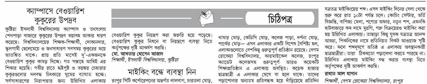 কুষ্টিয়া ইসলামী বিশ্ববিদ্যালয় ক্যাম্পাস ও তৎসংলগ্ন শেখপাড়া বাজারে কুকুরের উপদ্রব ভয়াবহ আকার ধারণ করেছে। বিশ্ববিদ্যালয়ের শিক্ষক-শিক্ষার্থী, দোকানদার, স্কুলগামী ছেলেমেয়ে ও জনসাধারণ সবসময় কুকুরের ভয়ে আতঙ্কিত থাকে। প্রায় প্রতি মাসেই দু’-একজনকে বেওয়ারিশ কুকুর কামড় দিচ্ছে। গত সপ্তাহে আমিই এর শিকার হয়েছি। গভীর রাতে হৃষ্টপুষ্ট ও ভয়ঙ্কর চেহারার কুকুরগুলোর দলবদ্ধ চিৎকারে ঘুমের ব্যাঘাত হচ্ছে। সর্বসাধারণের নিরাপত্তার জন্য উল্লেখিত এলাকায় বেওয়ারিশ কুকুর নিয়ন্ত্রণ করা জরুরি হয়ে পড়েছে। বেওয়ারিশ কুকুর নিধনে বা নিয়ন্ত্রণে ব্যবস্থা নিতে কর্তৃপক্ষের দৃষ্টি আকর্ষণ করছি।