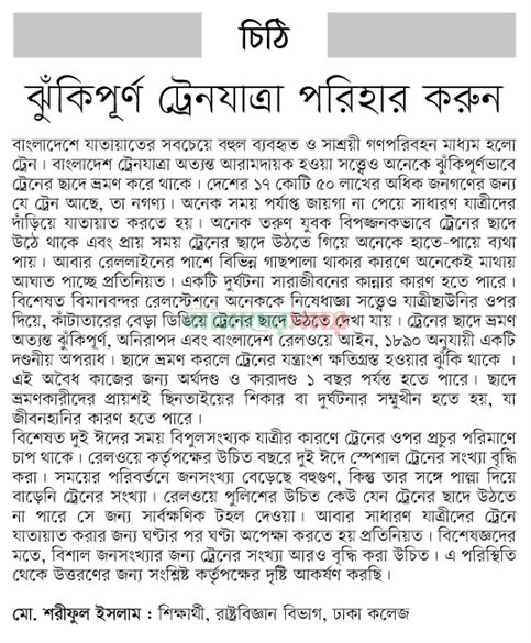 বাংলাদেশ ট্রেন যাত্রা অত্যন্ত আরামদায়ক সত্ত্বেও অনেকে ঝুঁকিপূর্ণ ভাবে ট্রেনের ছাদে ভ্রমণ করে থাকে। বাংলাদেশের জনসংখ্যা প্রায় ১৭ কোটি ৫০ লাখ এর অধিক জনগণের জন্য যে ট্রেন আছে , তা সংখ্যায় নগণ্য। জনগণের তুলনায় তা অপ্রতুল। অনেক সময় পর্যাপ্ত জায়গা না পেয়ে সাধারণ যাত্রীদের দাঁড়িয়ে যাতায়াত করতে হয়। অনেক তরুণ যুবক বিপদ জনক ভাবে ট্রেনের ছাদে উঠে থাকে, প্রায় সময় ট্রেনের ছাদে উঠতে গিয়ে অনেকে হাতে-পায়ে ব্যাথা পায়। আবার রেল লাইনের পাশে বিভিন্ন গাছপালা থাকার কারণে অনেকেই মাথায় আঘাত পাচ্ছে প্রতিনিয়ত। একটি দূর্ঘটনা সারা জীবনের কান্না হতে পারে। বিশেষত বিমান বন্দর রেল স্টেশনে অনেকে নিষেধাজ্ঞা সত্ত্বেও যাত্রী ছাউনীর উপর দিয়ে, কাঁটা তারের বেড়া ডিঙিয়ে ট্রেনের ছাদে উঠতে দেখা যায়। ট্রেনের ছাদে ভ্রমণ অত্যন্ত ঝুঁকিপূর্ণ, অনিরাপদ এবং বাংলাদেশ রেলওয়ে আইন, ১৮৯০ অনুযায়ী একটি দণ্ডনীয় অপরাধ । ছাদে ভ্রমণ করলে ট্রেনের যন্ত্রাংশ ক্ষতিগ্রস্ত হওয়ার ঝুঁকি থাকে । এই অবৈধ কাজের জন্য অর্থদণ্ড ও কারাদণ্ড ১ বছর পর্যন্ত হতে পারে। ছাদে ভ্রমণকারীদের প্রায়শই ছিনতাইকারী বা দুর্ঘটনার সম্মুখীন হতে হয়, যা জীবনহানির কারণ হতে পারে।