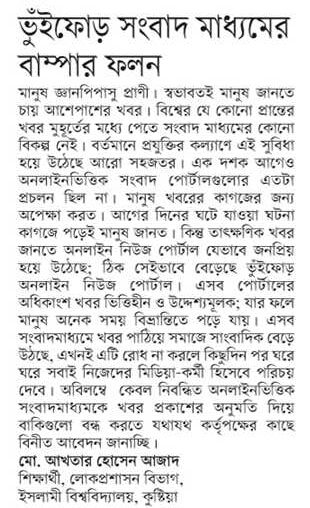 এক দশক আগেও অনলাইনভিত্তিক সংবাদ পোর্টালগুলোর এতটা প্রচলন ছিলনা। মানুষ কাগজের পত্রিকার জন্য অপেক্ষা করত। আগের দিনের ঘটে যাওয়া ঘটনা কাগজে ছাপা পত্রিকা পড়েই মানুষ জানত। কিন্তু তাৎক্ষনিক খবর জানতে অনলাইন নিউজ পোর্টাল যেভাবে জনপ্রিয় হয়ে উঠেছে; ঠিক সেইভাবে বেড়েছে ভুঁইফোড় অনলাইন নিউজ পোর্টাল। এসব পোর্টালের অধিকাংশ খবর প্রকাশ করা হয় ভিত্তিহীন ও উদ্দেশ্যমূলক; যার ফলে মানুষ অনেক সময় বিভ্রান্তিতে পড়ে যায়। এসব সংবাদমাধ্যমে খবর পাঠিয়ে সমাজে যেভাবে সাংবাদিক বেড়ে উঠছে, এখনই এটি রোধ না করলে কিছুদিন পর ঘরে ঘরে সবাই নিজেকে মিডিয়াকর্মী হিসেবে পরিচয় দিবে।