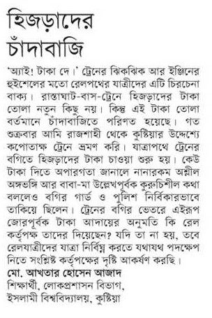 অ্যাই! টাকা দে। নইলে………! ট্রেনের ঝিকঝিক আর ইঞ্জিনের হুইশেলের মতো রেলপথের যাত্রীদের এটি যেন চিরচেনা বাক্য। হ্যাঁ, তৃতীয় লিঙ্গের মানুষ হিজড়াদের কথা বলছি। রাস্তাঘাট, বাস, ট্রেনে হিজড়াদের টাকা তোলা নতুন কিছু নয়। কিন্তু এই টাকা তোলা বর্তমানে চাঁদাবাজিতে পরিণত করেছে হিজড়া সম্প্রদায়। গত শুক্রবার আমি রাজশাহী থেকে কুষ্টিয়ার উদ্দেশ্যে কপোতাক্ষ ট্রেনে ভ্রমণ করি। যাত্রাপথে ট্রেনের বগিতে হিজড়াদের চাঁদাবাজি শুরু হয়। কেউ চাঁদা দিতে অপারগতা জানালে নানারকম অশ্লীল অঙ্গভঙ্গি আর বাবা-মা উল্লেখপূর্বক কুরূচিশীল কথা বললেও বগির গার্ড ও পুলিশ নির্বিকারভাবে তাকিয়ে ছিলেন। ট্রেনের বগির ভেতরে এইরূপ জোরপূর্বক চাঁদা আদায়ের অনুমতি কি রেল কর্তৃপক্ষ দিয়েছেন? যদি তা না হয়, তবে রেলপথের যাত্রীদের যাত্রা নির্বিঘ্ন করতে যথাযথ পদক্ষেপ গ্রহণে সরকারের সংশ্লিষ্ট কর্তৃপক্ষের দৃষ্টি আকর্ষণ করছি।