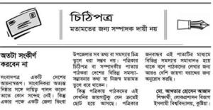 সংবাদপত্র একটি দেশের আয়নাস্বরূপ। সাংবাদিকেরা অত্যন্ত নিষ্ঠার সাথে দায়িত্ব পালন করেন তাতে কোনো সন্দেহ নেই। কিন্তু একার পক্ষে একটি জেলা কিংবা উপজেলার সকল তথ্য বা সমস্যার চিত্র তুলে ধরা সম্ভব নয়। পত্রিকার চিঠিপত্র বা সম্পাদকীয় পাতায় পাঠকরা দেশের বিভিন্ন সমস্যা-সম্ভাবনার কথা বা নিজস্ব মতামত তুলে ধরে থাকেন। কিন্তু পত্রিকায় পাঠকদের এই লেখনির জায়গাটুকু যেন ক্রমেই ছোট হয়ে আসছে। পত্রিকার জনবান্ধব এই পাতাটির মাধ্যমে বিভিন্ন সমস্যার সমাধানও হয়ে থাকে বলে পাঠকদের লেখার জন্য আরও বেশি জায়গা বরাদ্দের জন্য সম্পাদক সমীপে অনুরোধ করছি।