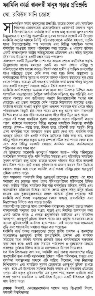 সাম্প্রতিক সময়ে দ্রব্যমূল্যের ঊর্ধ্বগতি, আয়ের বৈষম্য এবং সামাজিক নিরাপত্তা জোরদারের প্রয়োজনীয়তার প্রেক্ষাপটে সরকার নতুন উদ্যোগ হিসেবে ‘ফ্যামিলি কার্ড’ প্রকল্প চালু করেছে। মূলত দেশের নিম্নআয়ের ও হতদরিদ্র জনগোষ্ঠীকে সুরক্ষা দেওয়ার লক্ষ্যেই এই উদ্যোগ। ফ্যামিলি কার্ডের মাধ্যমে নির্দিষ্ট পরিবারগুলোকে আর্থিক সহায়তা, ভর্তুকি মূল্যে নিত্যপ্রয়োজনীয় পণ্য সরবরাহ এবং বিভিন্ন সামাজিক সুরক্ষা কর্মসূচির আওতায় আনার পরিকল্পনা করা হয়েছে। এ ধরনের উদ্যোগ একটি কল্যাণমূলক রাষ্ট্রের দায়িত্ববোধের প্রতিফলন এবং দরিদ্র মানুষের জীবনমান উন্নয়নের একটি সম্ভাবনাময় পদক্ষেপ।