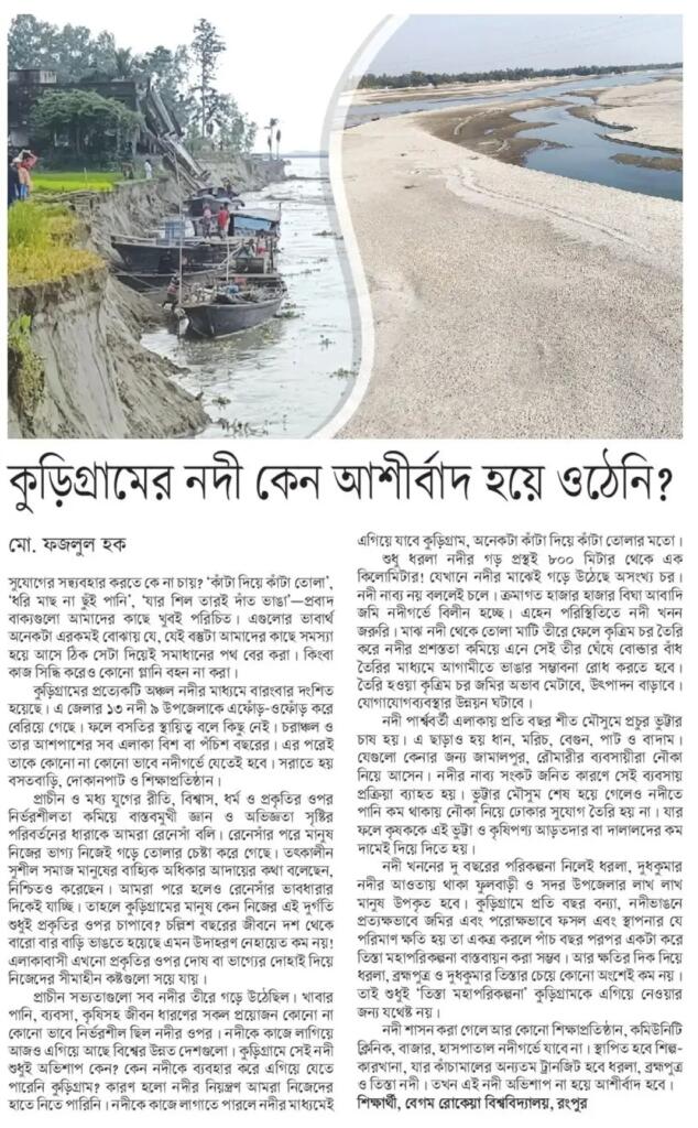 কুড়িগ্রামের নদী গুলোর অপার সম্ভাবনা নিয়ে আলোচনা করা হয়েছে এখানে। করে যাবে নদীগুলো শুধুই অভিশাপ না হয়ে আশীর্বাদ হতে পারতো যদি ক্ষেত্র বিশেষে ভিন্ন পদ্ধতিতে নদীগুলোকে ব্যবহার করা হতো। সে সমস্ত সম্ভাবনা নিয়েই লেখা হয়েছে এই কলাম।