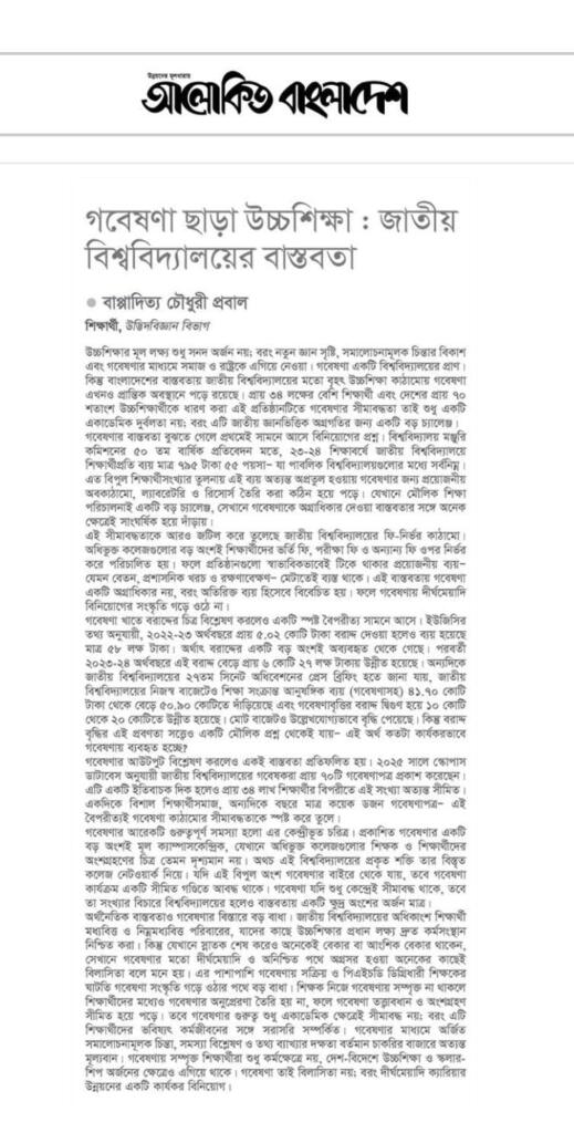 উচ্চশিক্ষার মূল লক্ষ্য শুধু সনদ অর্জন নয়; বরং নতুন জ্ঞান সৃষ্টি, সমালোচনামূলক চিন্তার বিকাশ এবং গবেষণার মাধ্যমে সমাজ ও রাষ্ট্রকে এগিয়ে নেওয়া। গবেষণা একটি বিশ্ববিদ্যালয়ের প্রাণ। কিন্তু বাংলাদেশের বাস্তবতায় জাতীয় বিশ্ববিদ্যালয়ের মতো বৃহৎ উচ্চশিক্ষা কাঠামোয় গবেষণা এখনও প্রান্তিক অবস্থানে পড়ে রয়েছে। প্রায় ৩৪ লক্ষের বেশি শিক্ষার্থী এবং দেশের প্রায় ৭০ শতাংশ উচ্চশিক্ষার্থীকে ধারণ করা এই প্রতিষ্ঠানটিতে গবেষণার সীমাবদ্ধতা তাই শুধু একটি একাডেমিক দুর্বলতা নয়; বরং এটি জাতীয় জ্ঞানভিত্তিক অগ্রগতির জন্য একটি বড় চ্যালেঞ্জ।