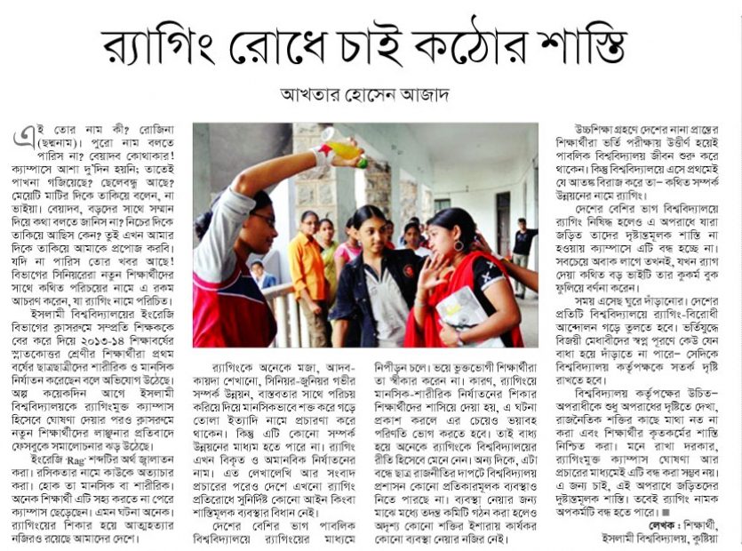 বিভাগের সিনিয়রেরা নবাগত শিক্ষার্থীদের সাথে কথিত পরিচয়ের নামে এইরকম জঘন্য আচরণ করে থাকে যা র্যাগিং নামে পরিচিত। সম্প্রতি ইসলামী বিশ্ববিদ্যালয়ের ইংরেজি বিভাগের ক্লাসরুম থেকে শিক্ষককে বের করে দিয়ে ২০১৩-১৪ শিক্ষাবর্ষের স্নাতকোত্তর শিক্ষার্থীদের কর্তৃক প্রথম বর্ষের শিক্ষার্থীদেরকে ক্লাসরুমে শারীরিক ও মানসিকভাবে নির্যাতনের অভিযোগ উঠেছে। অল্প কয়েকদিন আগে ইসলামী বিশ্ববিদ্যালয়কে র্যাগিংমুক্ত ক্যাম্পাস হিসেবে ঘোষণা দেবার পরেও ক্লাসরুমে নবাগত শিক্ষার্থীদেরকে লাঞ্চনার ফেসবুকে তীব্র প্রতিবাদের ঝড় চলছে।