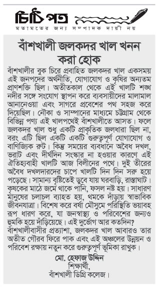 হুমকি হয়ে দাঁড়িয়েছে। এই দুর্ভোগ আর কতদিন? বাঁশখালীবাসীর প্রত্যাশা, জলকদর খাল আবারও তার অতীত গৌরব ফিরে পাক এবং এই অঞ্চলের উন্নয়ন ও পরিবেশ রক্ষায় নতুন করে গুরুত্বপূর্ণ ভূমিকা রাখুক।