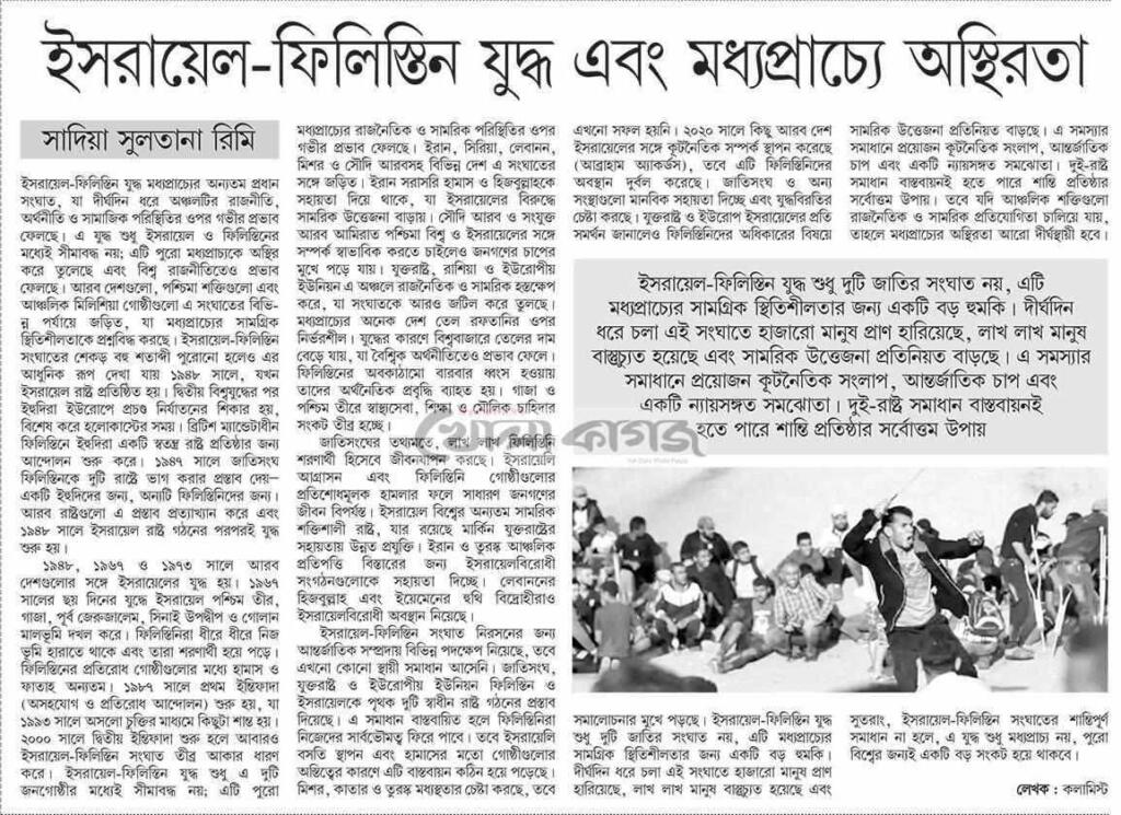 ইসরাইল-ফিলিস্তিন যুদ্ধ শুধু দুটি জাতির সংঘাত নয়, এটি মধ্যপ্রাচ্যের সামগ্রিক স্থিতিশীলতার জন্য একটি বড় হুমকি। দীর্ঘদিন ধরে চলা এই সংঘাতে হাজারো মানুষ প্রাণ হারিয়েছে, লাখ লাখ মানুষ বাস্তুচ্যুত হয়েছে এবং সামরিক উত্তেজনা প্রতিনিয়ত বাড়ছে।এই সমস্যার সমাধানে প্রয়োজন কূটনৈতিক সংলাপ, আন্তর্জাতিক চাপ এবং একটি ন্যায়সঙ্গত সমঝোতা। দুই-রাষ্ট্র সমাধান বাস্তবায়নই হতে পারে শান্তি প্রতিষ্ঠার সর্বোত্তম উপায়। তবে যদি আঞ্চলিক শক্তিগুলো রাজনৈতিক ও সামরিক প্রতিযোগিতা চালিয়ে যায়, তাহলে মধ্যপ্রাচ্যের অস্থিরতা আরও দীর্ঘস্থায়ী হবে। সুতরাং, ইসরাইল-ফিলিস্তিন সংঘাতের শান্তিপূর্ণ সমাধান না হলে, এই যুদ্ধ শুধু মধ্যপ্রাচ্য নয়, পুরো বিশ্বের জন্যই একটি বড় সংকট হয়ে থাকবে।