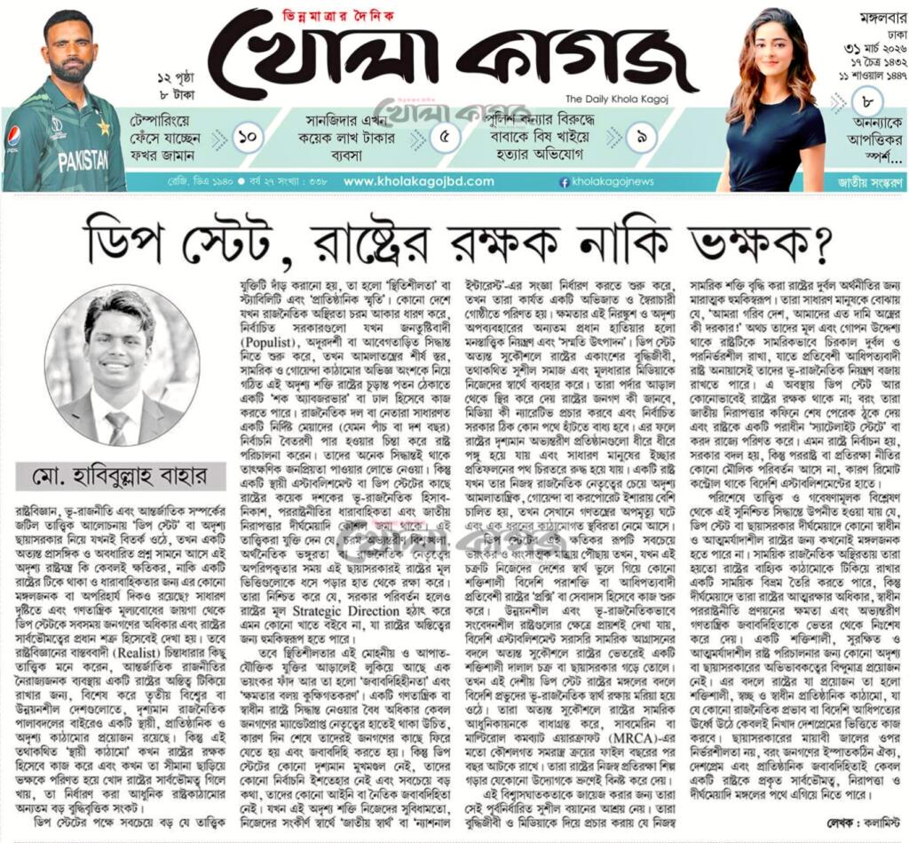 ডিপ স্টেট: রাষ্ট্রের রক্ষক নাকি ভক্ষক? (প্রকাশিত,খোলা কাগজ,৩১ মার্চ মঙ্গলবার -২০২৬ইং)