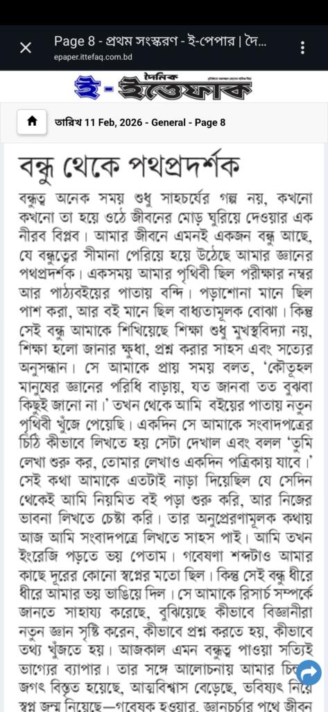 বন্ধুত্ব অনেক সময় শুধু সহচর্যের গল্প নয়, কখনো কখনো তা হয়ে ওঠে জীবনের মোড় ঘুরিয়ে দেওয়ার এক নীরব বিপ্লব। আমার জীবনে এমনই একজন বন্ধু আছে, যে বন্ধুত্বের সীমানা পেরিয়ে হয়ে উঠেছে আমার জ্ঞানের পথপ্রদর্শক, আমার গবেষণার স্বপ্নের প্রথম প্রদীপ। একসময় আমার পৃথিবী ছিল পরীক্ষার নম্বর আর পাঠ্যবইয়ের পাতায় বন্দি। পড়াশোনা মানে ছিল পাশ করা, আর বই মানে ছিল বাধ্যতামূলক বোঝা। কিন্তু সেই বন্ধু আমাকে শিখিয়েছে শিক্ষা শুধু মুখস্থ বিদ্যা নয়, শিক্ষা হলো জানার ক্ষুধা, প্রশ্ন করার সাহস এবং সত্যের অনুসন্ধান। সে আমাকে প্রায় সময় বলত “কৌতূহল মানুষের জ্ঞানের পরিধি বাড়ায়, যত জানবা তত বুঝবা কিছুই জান না”। তখন থেকে আমি বইয়ের পাতায় নতুন পৃথিবী খুঁজে পেয়েছি। একদিন সে আমাকে সংবাদপত্রের চিঠি কিভাবে লিখতে হয় সেটা দেখালো এবং বলল “তুমি লিখা শুরু করো , তোমার লেখাও একদিন পত্রিকায় যাবে।” সেই কথা আমাকে এতটাই নাড়া দিয়েছিল যে সেদিন থেকেই আমি নিয়মিত বই পড়া শুরু করি, আর নিজের ভাবনা লিখতে চেষ্টা করি। তার অনুপ্রেরণামূলক কথায় আজ আমি সংবাদপত্রে লিখতে সাহস পাই। আমি তখন ইংরেজি পড়তে ভয় পেতাম। গবেষণা শব্দটাও আমার কাছে দূরের কোনো স্বপ্নের মতো ছিল। কিন্তু সেই বন্ধু ধীরে ধীরে আমার ভয় ভাঙিয়ে দিল। সে আমাকে রিসার্চ সম্পর্কে জানতে সাহায্য করেছে, বুঝিয়েছে কীভাবে বিজ্ঞানীরা নতুন জ্ঞান সৃষ্টি করেন, কীভাবে প্রশ্ন করতে হয়, কীভাবে তথ্য খুঁজতে হয়। তাঁর কথায় প্রথমবার আমি বুঝেছিলাম একজন সাধারণ শিক্ষার্থীও গবেষক হতে পারে, চিন্তাশীল লেখক হতে পারে। আজকাল এমন বন্ধুত্ব পাওয়া সত্যিই ভাগ্যের ব্যাপার। তাঁর সাথে আলোচনায় আমার চিন্তার জগৎ বিস্তৃত হয়েছে, আত্মবিশ্বাস বেড়েছে, ভবিষ্যৎ নিয়ে স্বপ্ন জন্ম নিয়েছে—গবেষক হওয়ার, জ্ঞানচর্চার পথে জীবন উৎসর্গ করার, সমাজের জন্য কিছু করার। আজ আমি যখন গবেষণার কথা ভাবি, তখন মনে হয় একজন মানুষের জীবনে একজন সঠিক বন্ধু কতটা আলো জ্বালাতে পারে।