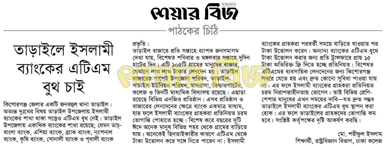 কিশোরগঞ্জ জেলার একটি জনবহুল থানা তাড়াইল। অত্যন্ত দুঃখের বিষয় তাড়াইল উপজেলায় ইসলামী ব্যাংকের শাখা থাকা সত্ত্বেও এটিএম বুথ নেই। তাড়াইল উপজেলায় একাধিক ব্যাংকের শাখা রয়েছে। উদাহরণ স্বরুপ- ডাচ বাংলা ব্যাংক, এশিয়া ব্যাংক, ব্র্যাক ব্যাংক, ন্যাশনাল ব্যাংক, কৃষি ব্যাংক, সোনালী ব্যাংক ও পূবালী ব্যাংক ইত্যাদি। তাড়াইল বাজারে প্রতি সপ্তাহে ব্যাপক জন সমাগম দেখা যায় বিশেষত শনিবার ও মঙ্গলবার সপ্তাহে দুই দিন হাটের দিন। ১০৫ টি গ্রামের মানুষের বাজার, যেখানে লাখ-লাখ টাকার লেনদেন হয়। তাড়াইল বাজারের পাশেই উপজেলা পরিষদ, তাড়াইল-সাচাইল ইউনিয়ন পরিষদ, মাদ্রাসা, কিন্ডার গার্ডেন, কলেজ, ৩ টি মাধ্যমিক বিদ্যালয় রয়েছে। এছাড়াও রয়েছে বিভিন্ন এনজিও প্রতিষ্ঠান। এই সব প্রতিষ্ঠান ও বাজারের লেনদেনের ক্ষেত্রে ব্যাংক একমাত্র মাধ্যম। যার ফলে ইসলামী ব্যাংকের গ্রাহকরা প্রতিনিয়ত চরম ভোগান্তি পোহাতে হচ্ছে। বিশেষ করে বছরের ২ টি ঈদে অনেক মানুষ বিভিন্ন শহর থেকে গ্রামের বাড়িতে যায়। অনেকেই ছিনতাই কারীর কারণে এটিএম থেকে টাকা উত্তোলন করে সঙ্গে নিতে পারে না। ইসলামী ব্যাংকের গ্রাহকরা পরবর্তীতে বাড়িতে যাওয়ার পর টাকা উত্তোলন করেন । অন্যান্য ব্যাংকের এটিএম বুথে টাকা উত্তোলন করার জন্য প্রতি ট্রান্সফারে প্রায় ১৫ টাকা অতিরিক্ত ফ্রি দিতে হচ্ছে প্রতিনিয়ত। বিশেষত এটিএমের ব্যবসায়িক লেনদেনের জন্য কিশোরগঞ্জ সদরে যেতে হয় এবং দ্রুত কোনো সুবিধা পাওয়া যায় না। যার ফলে ইসলামী ব্যাংকের গ্রাহকরা প্রতিনিয়ত চরম নিরাপত্তাহীনতায় ভোগে । তাই বিভিন্ন শ্রেণী-পেশার মানুষের এখন সময়ের দাবি, যতদ্রুত সম্ভব তাড়াইলে ইসলামী ব্যাংকে এটিএম বুথ স্থাপন করা হোক, এর ফলে তাড়াইলের গ্রাহকদের ভোগান্তি কম হবে। সংশ্লিষ্ট কর্তৃপক্ষের দৃষ্টি আকর্ষণ করছি।