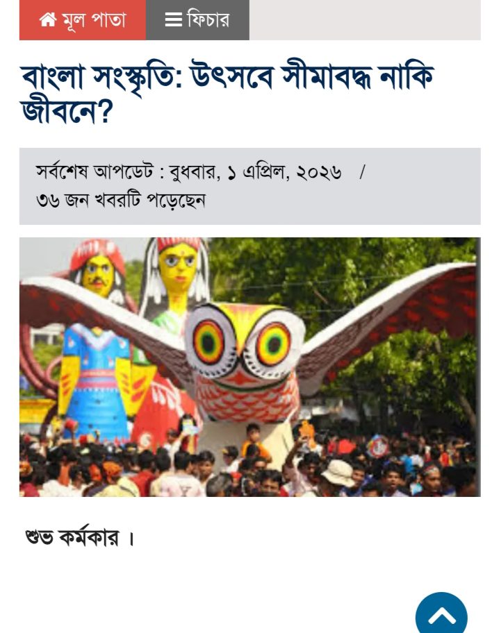 হোম / কলাম/মতামত / নিবন্ধবাংলা সংস্কৃতি : উৎসবে সীমাবদ্ধ নাকি জীবনে? শুভ কর্মকার , বেগম রোকেয়া বিশ্ববিদ্যালয়, রংপুর প্রকাশ: ১ এপ্রিল ২০২৬ পাঠ: ৫৪ বার বাংলা সংস্কৃতি উৎসবে সীমাবদ্ধ নাকি জীবনে?লেখক: সম্পাদকীয় পর্ষদ, বেগম রোকেয়া বিশ্ববিদ্যালয়।এই লেখাটি ১ এপ্রিল ২০২৬ তারিখে টেলিগ্রাফ পত্রিকায় প্রকাশিত। লেখাটি শেয়ার করুন: