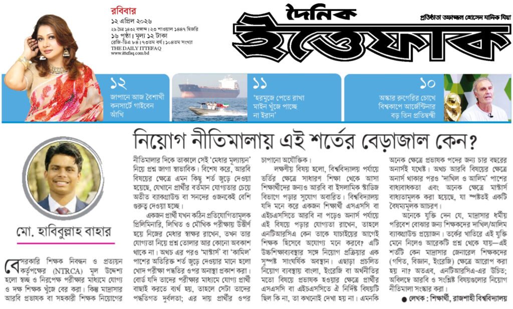 অতএব, এনটিআরসিএ-এর উচিত অবিলম্বে আরবি ও সংশ্লিষ্ট বিষয়গুলোর নিয়োগ নীতিমালা সংস্কার করা, যাতে সকল যোগ্য প্রার্থী সমান সুযোগ পায় এবং নিয়োগ প্রক্রিয়ায় স্বচ্ছতা ও ন্যায়বিচার নিশ্চিত হয়।