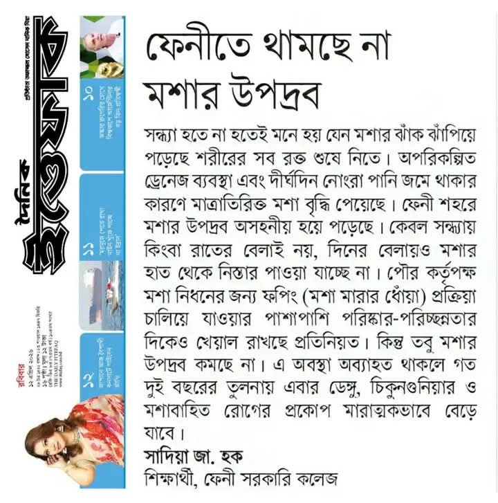 সন্ধ্যা হতে না হতেই মনে হয় যেন মশার ঝাঁক লুট করে নিতে এসেছে শরীরের সব রক্ত। অপরিকল্পিত ড্রেনেজ ব্যবস্থা এবং দীর্ঘ দিন নোংরা পানি জমে থাকার কারণে মাত্রাতিরিক্ত মশার বংশ বৃদ্ধি হয়েছে এবং হয়ে চলছে। ফেনী শহরে মশার উপদ্রব অসহনীয় হয়ে পড়েছে। কেবল সন্ধ্যায় কিংবা রাতেই নয়, দিনের বেলায়ও মশার হাত থেকে নিস্তার পাচ্ছে না মানুষ। পৌর কর্তৃপক্ষ মশা নিধনের জন্য ফপিং (মশা মারার ধোঁয়া) প্রক্রিয়া চালিয়ে যাচ্ছে। এর পাশাপাশি পরিষ্কার-পরিচ্ছন্নতার দিকেও খেয়াল রাখছে। কিন্তু তবু যেন মশার উপদ্রব কমছে না বরং বৃদ্ধি পাচ্ছে আরো আরো। আশঙ্কা করা যাচ্ছে যে, গত দুই বছরের তুলনায় এবার ডেঙ্গু,চিকুনগুনিয়ার ও মশাবাহিত রোগের প্রকোপ মারাত্মকভাবে বেড়ে যাবে