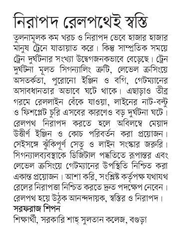 রেলপথ নিরাপদ করতে হলে অবিলম্বে মেয়াদ উত্তীর্ণ ইঞ্জিন ও কোচ পরিবর্তন করা প্রয়োজন। সেই সঙ্গে ঝুঁকিপূর্ণ সেতু ও লাইন সংস্কার জরুরি। সিগন্যাল ব্যবস্থাকে ডিজিটাল পদ্ধতিতে রূপান্তর এবং লেভেল ক্রসিংয়ে গেটম্যানের উপস্থিতি নিশ্চিত করা একান্ত প্রয়োজন। আশা করি, সংশ্লিষ্ট কর্তৃপক্ষ যথাযথ রেলের নিরাপত্তা নিশ্চিত করতে দ্রুত পদক্ষেপ নেবেন।রেলপথ হয়ে উঠুক আনন্দদায়ক, স্বস্তির ও নিরাপদ।