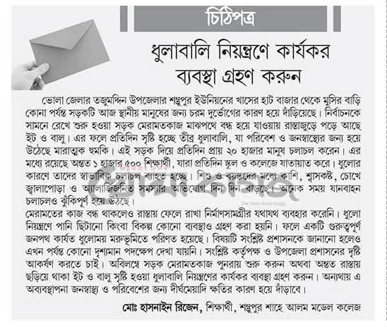 মেরামতের কাজ বন্ধ থাকলেও রাস্তায় ফেলে রাখা নির্মাণসামগ্রীর যথাযথ ব্যবহার করেনি। ধুলো নিয়ন্ত্রণে পানি ছিটানো কিংবা বিকল্প কোনো ব্যবস্থাও গ্রহণ করা হয়নি। ফলে একটি গুরুত্বপূর্ণ জনপথ কার্যত ধুলোময় মরুভূমিতে পরিণত হয়েছে। বিষয়টি সংশ্লিষ্ট প্রশাসনকে জানানো হলেও এখন পর্যন্ত কোনো দৃশ্যমান পদক্ষেপ দেখা যায়নি। সংশ্লিষ্ট কর্তৃপক্ষ ও উপজেলা প্রশাসনের দৃষ্টি আকর্ষণ করতে চাই। অবিলম্বে সড়ক মেরামতকাজ পুনরায় শুরু করুন অথবা অন্তত রাস্তায় ছড়িয়ে থাকা ইট ও বালু সৃষ্টি হওয়া ধুলাবালি নিয়ন্ত্রণের কার্যকর ব্যবস্থা গ্রহণ করুন। অন্যথায় এই অব্যবস্থাপনা জনস্বাস্থ্য ও পরিবেশের জন্য দীর্ঘমেয়াদি ক্ষতির কারণ হয়ে দাঁড়াবে।