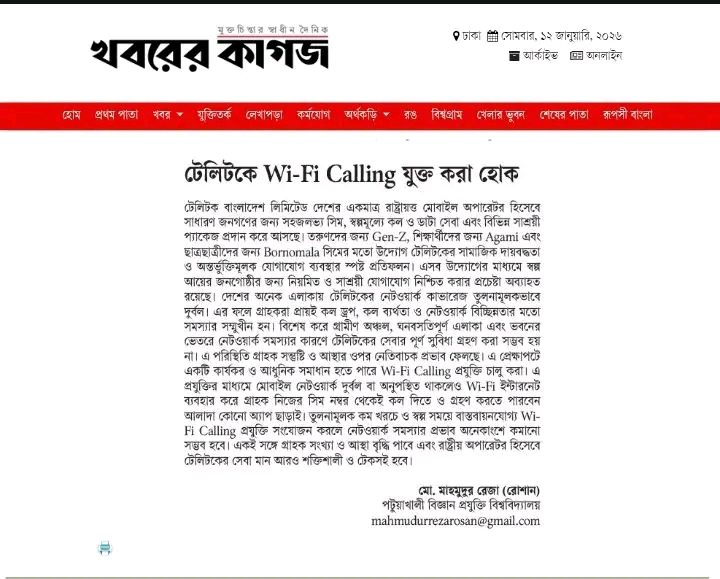 টেলিটক বাংলাদেশ লিমিটেড দেশের একমাত্র রাষ্ট্রায়ত্ত মোবাইল অপারেটর হিসেবে সাধারণ জনগণের জন্য সহজলভ্য সিম, স্বল্পমূল্যে কল ও ডাটা সেবা এবং বিভিন্ন সাশ্রয়ী প্যাকেজ প্রদান করে আসছে। তরুণদের জন্য Gen-Z, শিক্ষার্থীদের জন্য Agami এবং ছাত্রছাত্রীদের জন্য Bornomala সিমের মতো উদ্যোগ টেলিটকের সামাজিক দায়বদ্ধতা ও অন্তর্ভুক্তিমূলক যোগাযোগ ব্যবস্থার স্পষ্ট প্রতিফলন। এসব উদ্যোগের মাধ্যমে স্বল্প আয়ের জনগোষ্ঠীর জন্য নিয়মিত ও সাশ্রয়ী যোগাযোগ নিশ্চিত করার প্রচেষ্টা অব্যাহত রয়েছে। দেশের অনেক এলাকায় টেলিটকের নেটওয়ার্ক কাভারেজ তুলনামূলকভাবে দুর্বল। এর ফলে গ্রাহকরা প্রায়ই কল ড্রপ, কল ব্যর্থতা ও নেটওয়ার্ক বিচ্ছিন্নতার মতো সমস্যার সম্মুখীন হন। বিশেষ করে গ্রামীণ অঞ্চল, ঘনবসতিপূর্ণ এলাকা এবং ভবনের ভেতরে নেটওয়ার্ক সমস্যার কারণে টেলিটকের সেবার পূর্ণ সুবিধা গ্রহণ করা সম্ভব হয় না। এ পরিস্থিতি গ্রাহক সন্তুষ্টি ও আস্থার ওপর নেতিবাচক প্রভাব ফেলছে। এ প্রেক্ষাপটে একটি কার্যকর ও আধুনিক সমাধান হতে পারে Wi-Fi Calling প্রযুক্তি চালু করা। এ প্রযুক্তির মাধ্যমে মোবাইল নেটওয়ার্ক দুর্বল বা অনুপস্থিত থাকলেও Wi-Fi ইন্টারনেট ব্যবহার করে গ্রাহক নিজের সিম নম্বর থেকেই কল দিতে ও গ্রহণ করতে পারবেন আলাদা কোনো অ্যাপ ছাড়াই। তুলনামূলক কম খরচে ও স্বল্প সময়ে বাস্তবায়নযোগ্য Wi-Fi Calling প্রযুক্তি সংযোজন করলে নেটওয়ার্ক সমস্যার প্রভাব অনেকাংশে কমানো সম্ভব হবে। একই সঙ্গে গ্রাহক সংখ্যা ও আস্থা বৃদ্ধি পাবে এবং রাষ্ট্রীয় অপারেটর হিসেবে টেলিটকের সেবা মান আরও শক্তিশালী ও টেকসই হবে।
